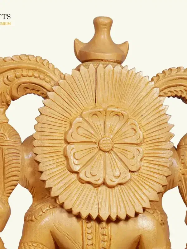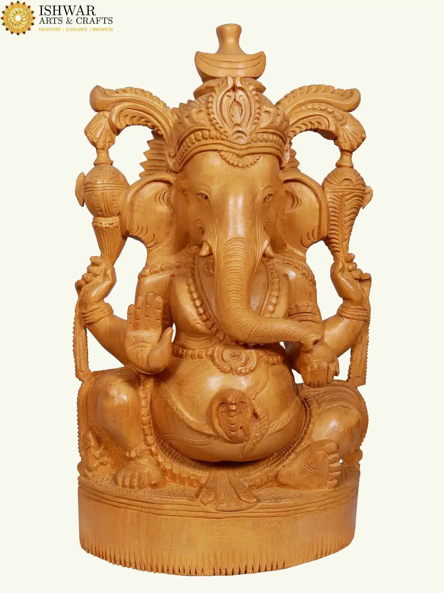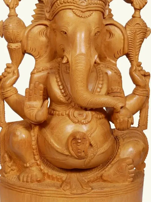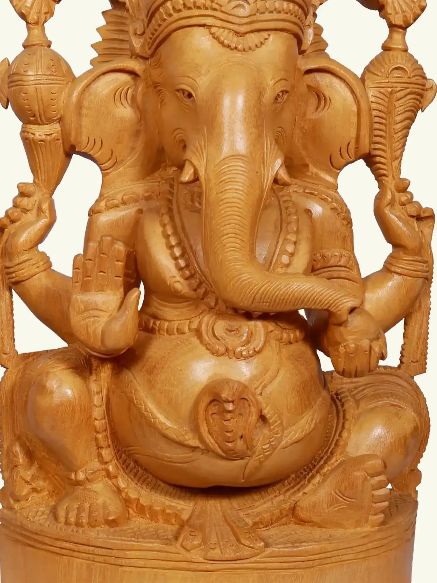 Crafted from fine whitewood, the statue showcases remarkable artistry. The natural grain of the wood enhances the delicate features—the expressive trunk, gentle eyes and ornate adornments—each detail reflecting devotion and cultural reverence. The lotus pedestal beneath him symbolizes purity and spiritual awakening, reminding devotees of the blossoming of consciousness and the transcendence of worldly attachments.
