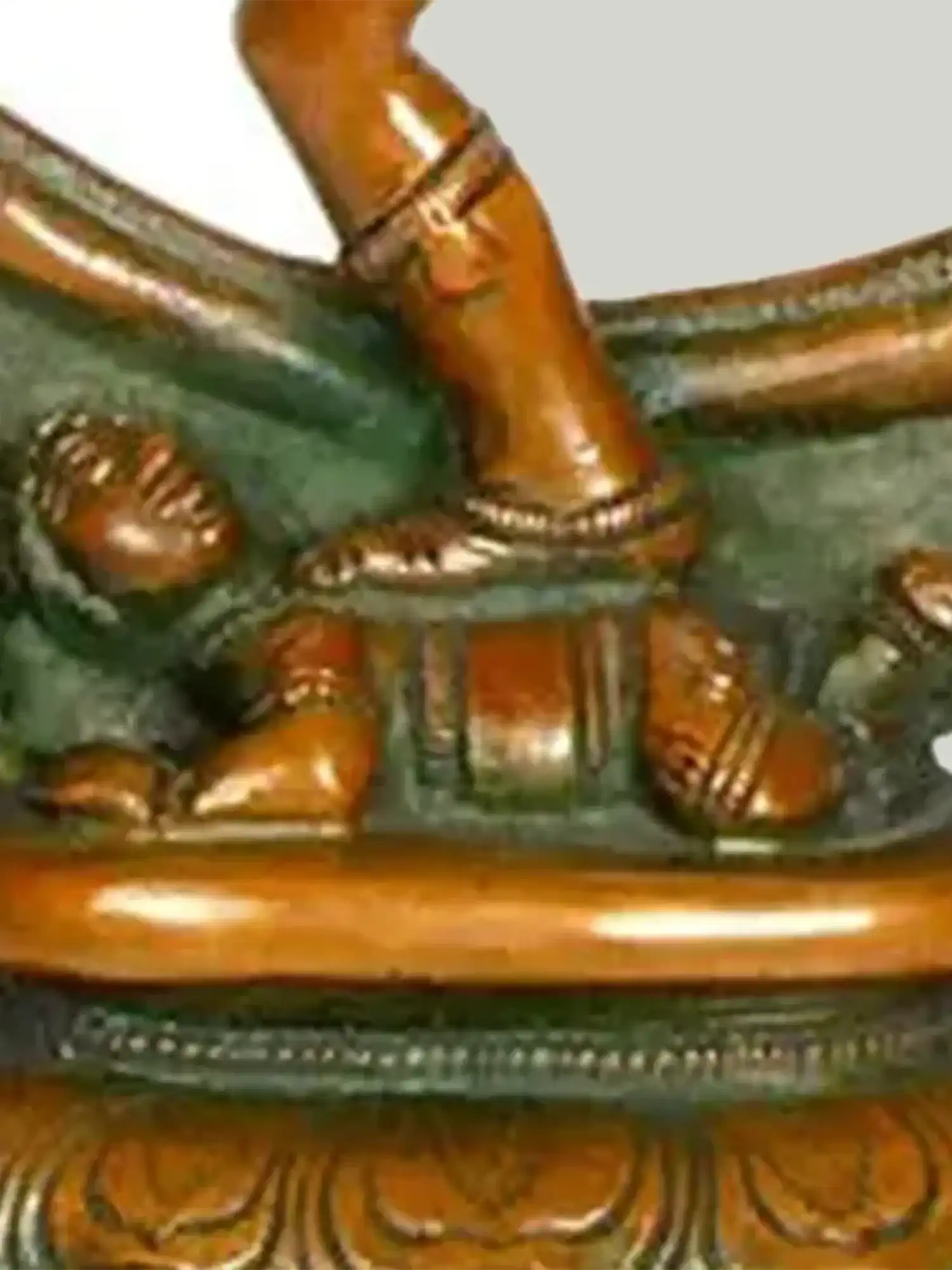 Each gesture, each flame encircling Him, radiates spiritual energy, while His raised foot offers liberation to the soul. The demon beneath his feet represents ignorance vanquished by divine wisdom. This handcrafted brass idol is not merely a decorative piece—it is a sacred icon of transformation, deeply revered by classical dancers, yogis, and devotees alike. The intricate detailing, from His flowing locks to the lotus base, reflects the timeless elegance of Indian metal art and the spiritual grandeur of Lord Shiva.