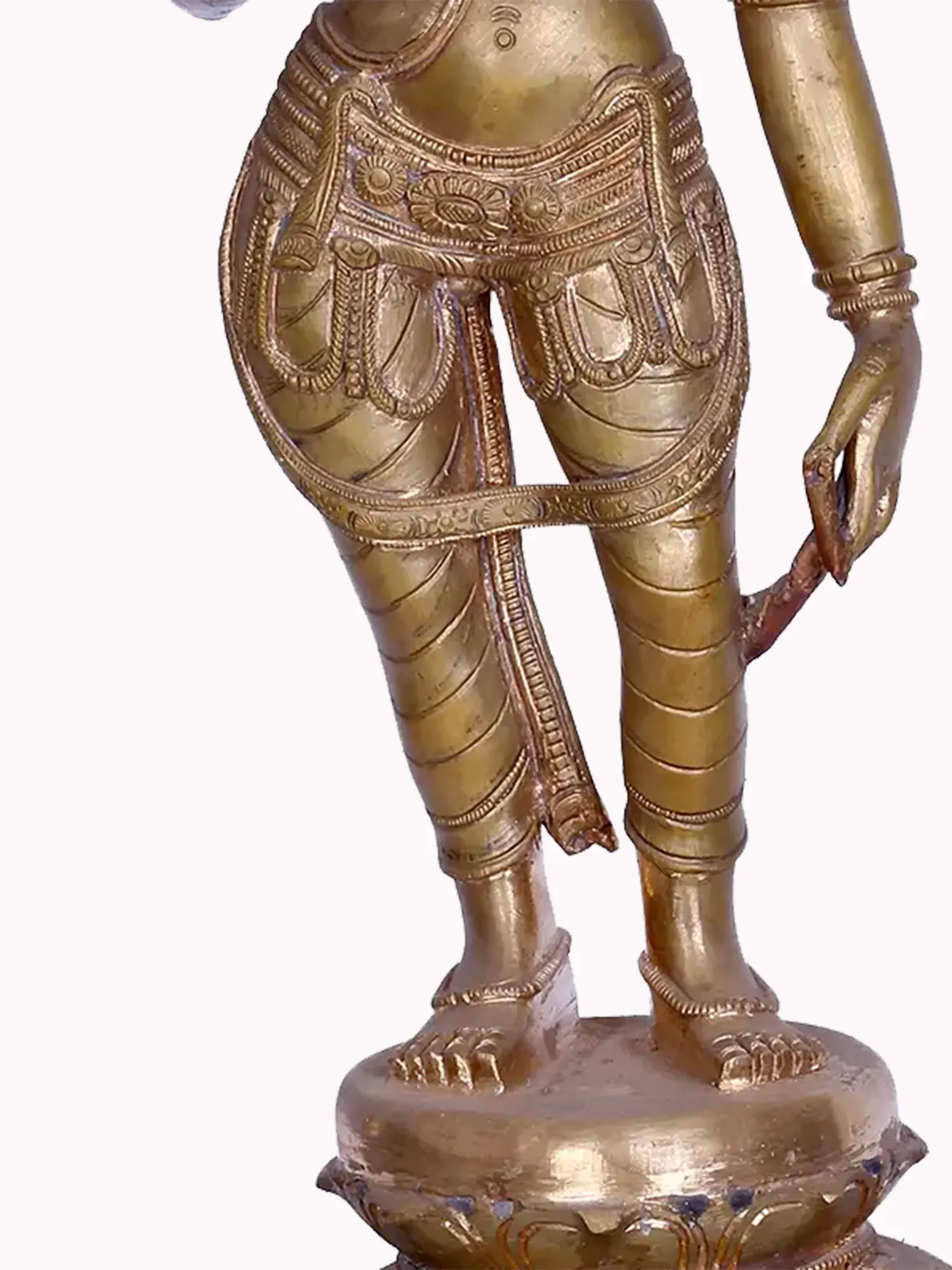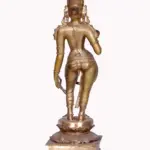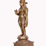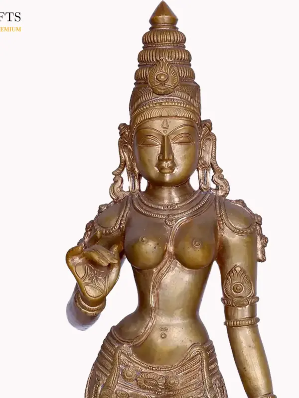 This elegant Goddess Parvati statue is crafted in solid bronze, inspired by the timeless Chola-style temple sculptures of South India. Standing gracefully on a lotus pedestal, the Devi is depicted in a serene and composed posture, radiating divine beauty, strength and compassion. The refined detailing in her ornaments, crown and attire showcases the mastery of traditional metal artisanship.