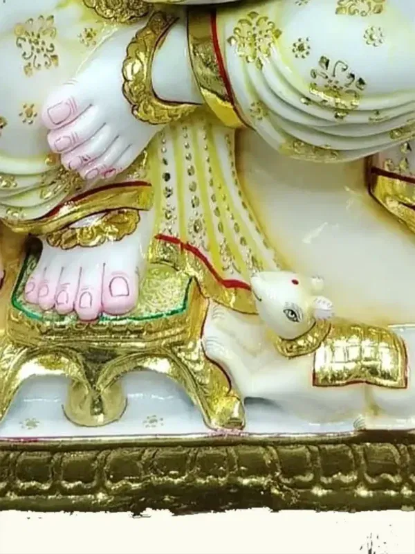 Seated upon a majestic seat, supported by silken bolsters, Ganesha’s form reflects both serenity and authority. His gentle gaze, animated with compassion, invites peace into the hearts of devotees, while the delicate white attire and golden ornaments highlight his celestial majesty. The crown upon his head, adorned with intricate embellishments, signifies his sovereignty over the realms of wisdom and abundance. At his feet rests Mushika, his faithful vahana, symbolizing humility and the triumph of devotion over limitation.