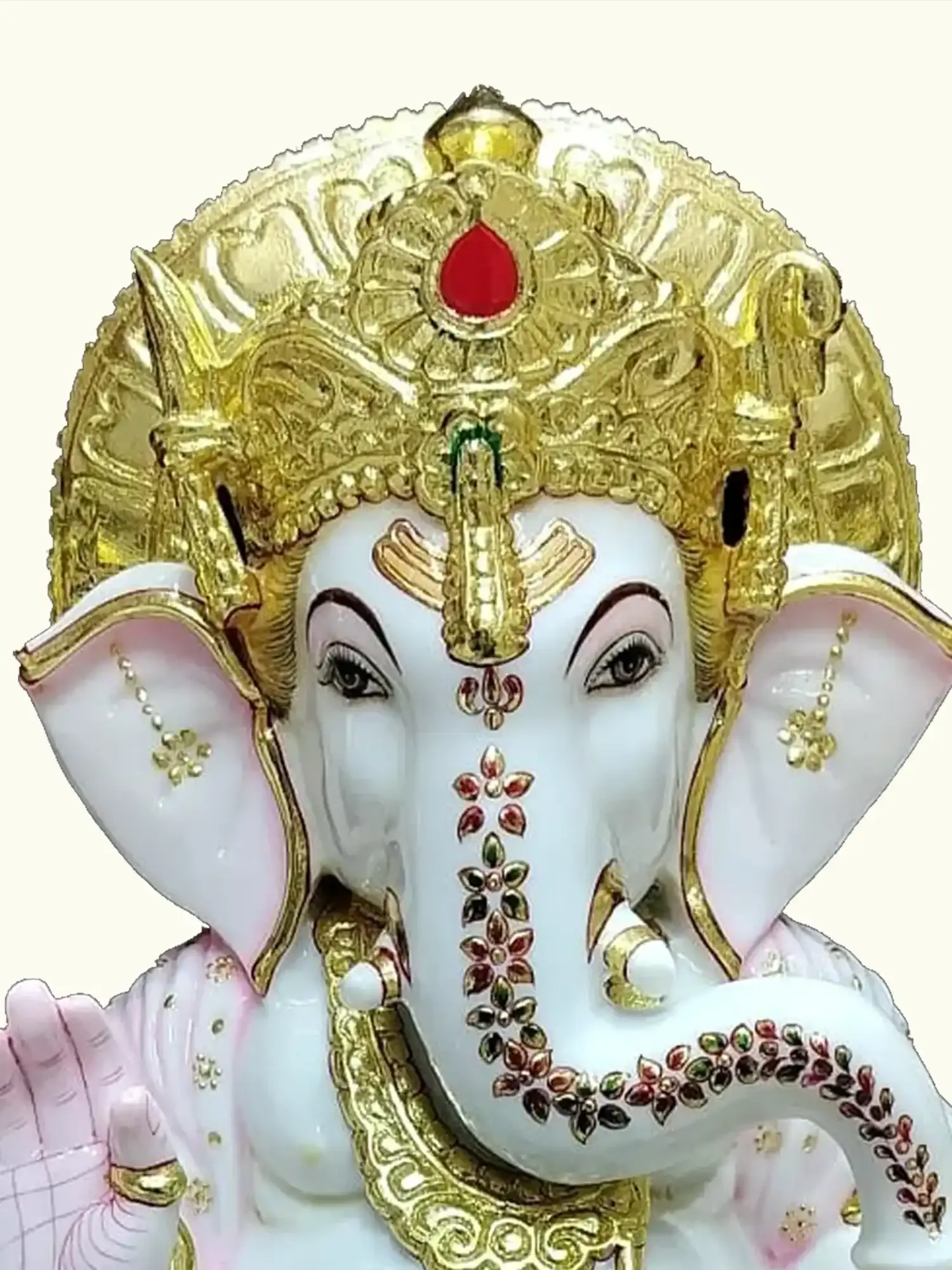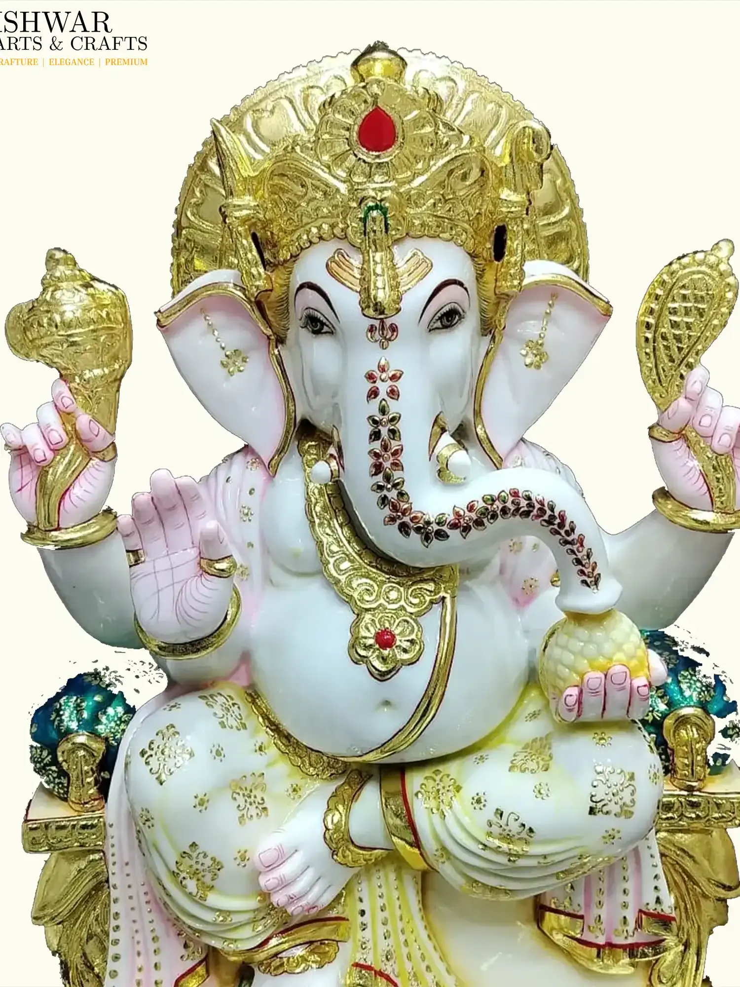 Lord Ganesha, revered as the universal king and the eternal remover of obstacles, is celebrated as the embodiment of wisdom, prosperity and auspiciousness. His divine presence is invoked at the commencement of every sacred undertaking, for he is the guardian of success and the patron of arts and sciences. This magnificent marble murti, sculpted from the pristine stone of Vietnam, radiates purity and elegance, capturing the grandeur of Ganapati enthroned in regal splendour.