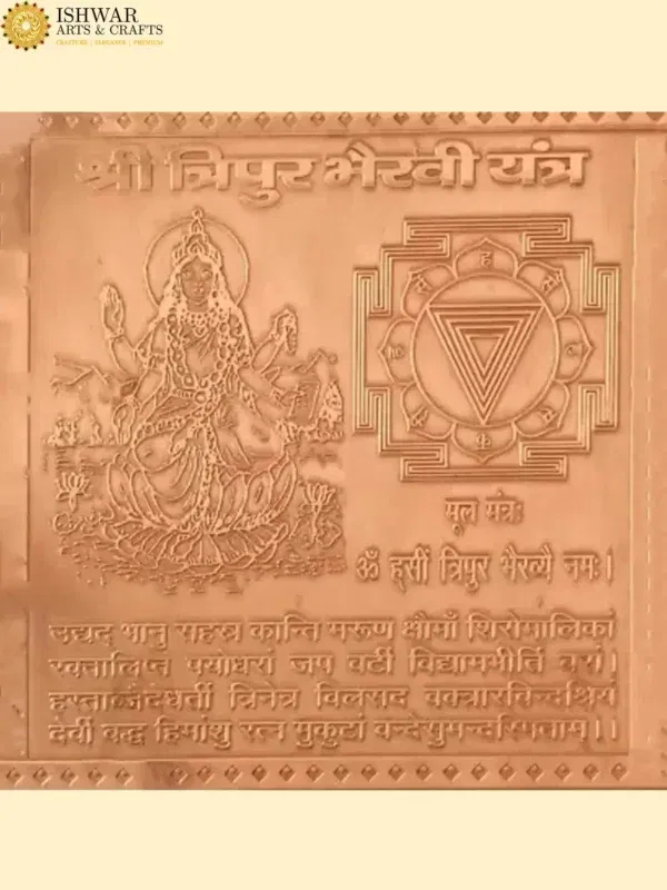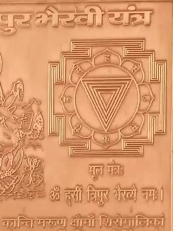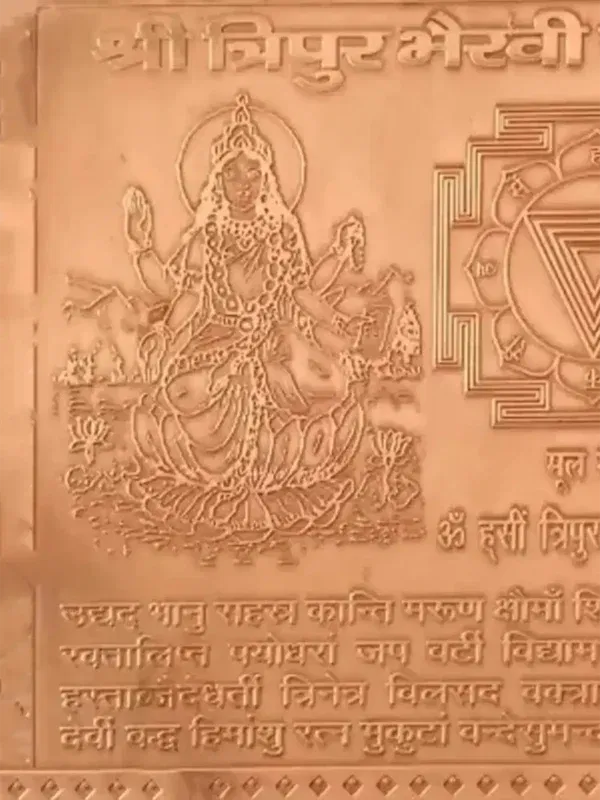 Tripura Bhairavi is honored as the fiery aspect of the Divine Mother, symbolizing both creation and dissolution. She is depicted with potent attributes such as the sword and skull cup, representing transcendence over limitations and the destruction of ignorance. Through her worship, practitioners seek courage, wisdom and liberation from obstacles. This yantra, etched with her symbols and mantras, becomes a conduit for her protective grace, dispelling negativity and fostering empowerment.