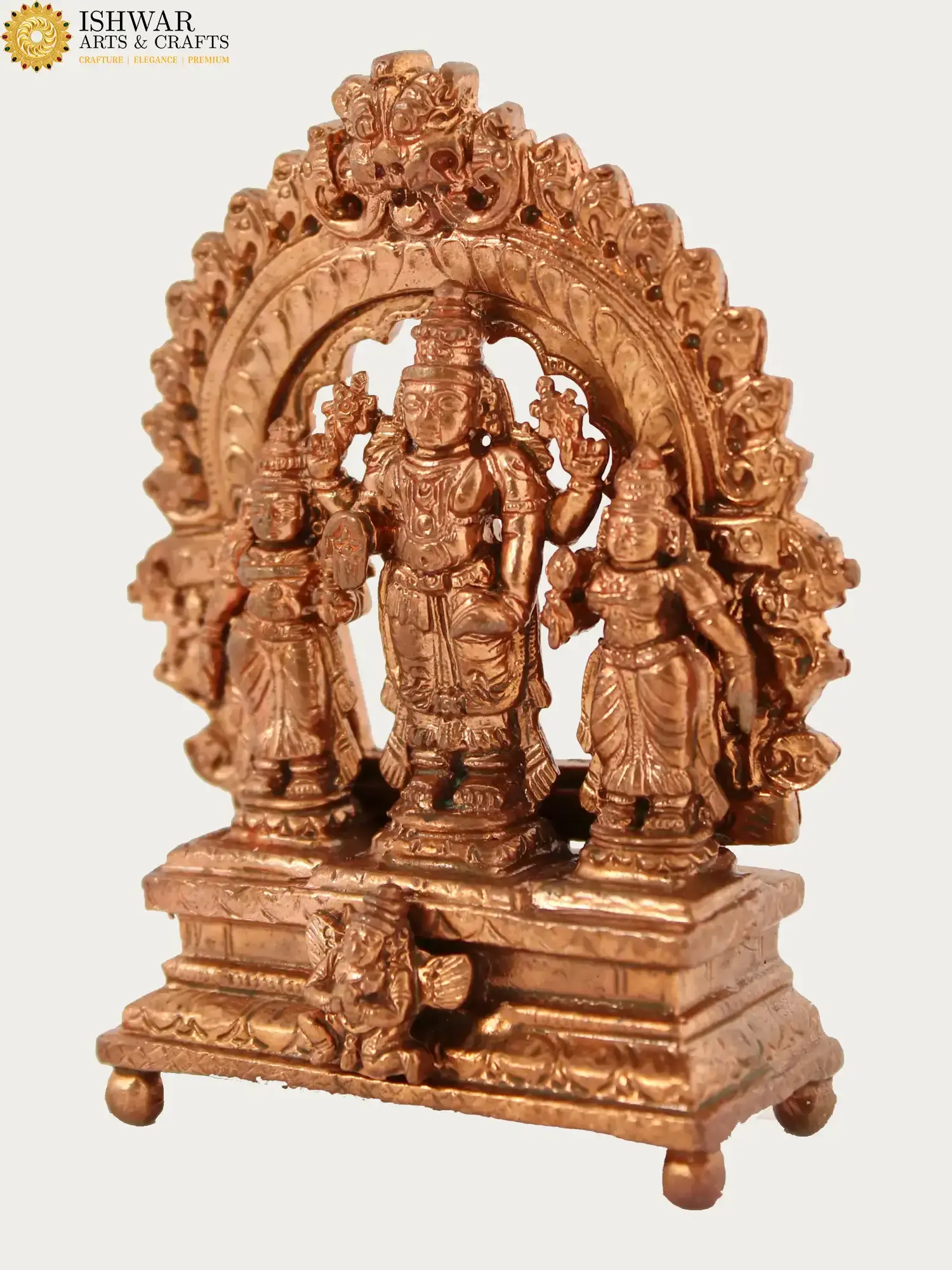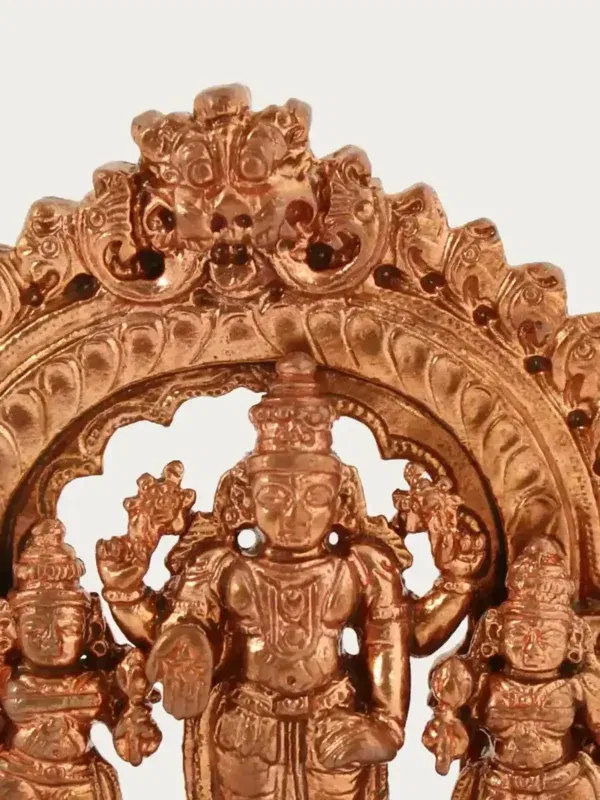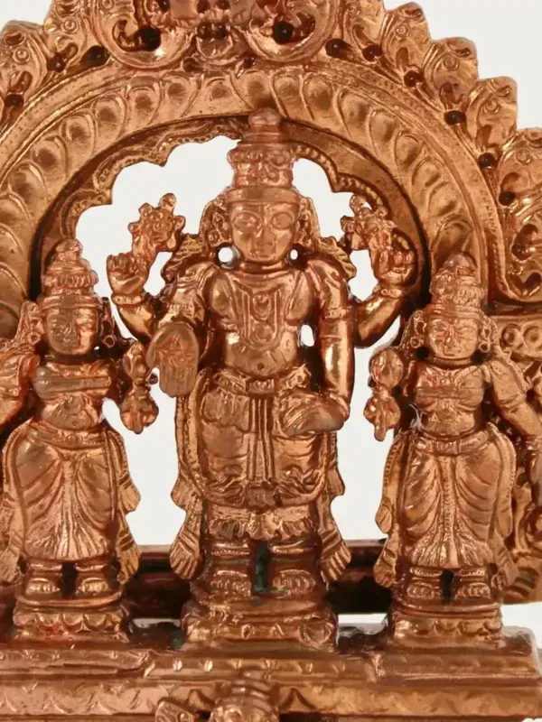 Compact yet powerful, this 3-inch copper statue is ideal for home altars, meditation spaces or as a decorative centerpiece. It serves as a conduit of divine blessings, inviting peace, prosperity and protection into your surroundings. Whether gifted on auspicious occasions or cherished as a personal treasure, it embodies devotion, artistry and the eternal presence of Perumal with Sridevi and Bhudevi.