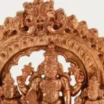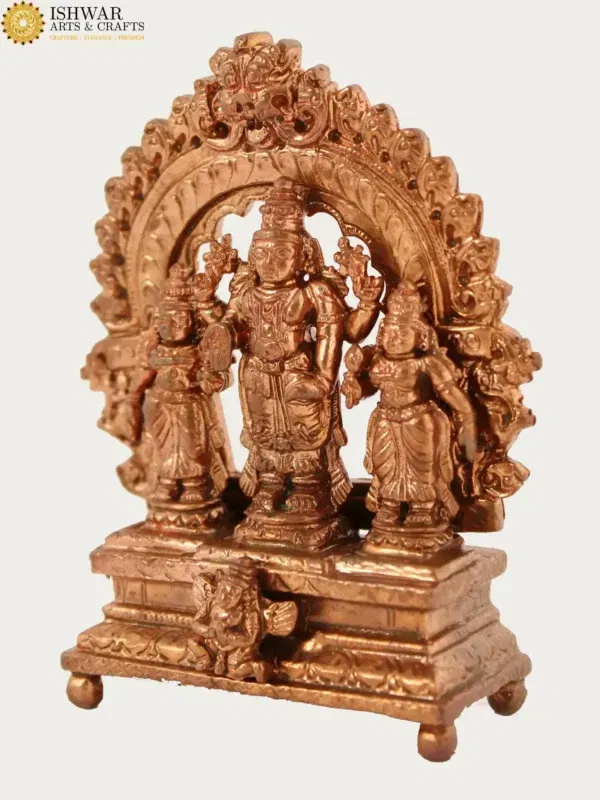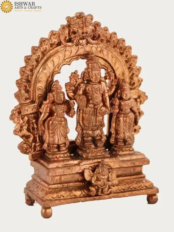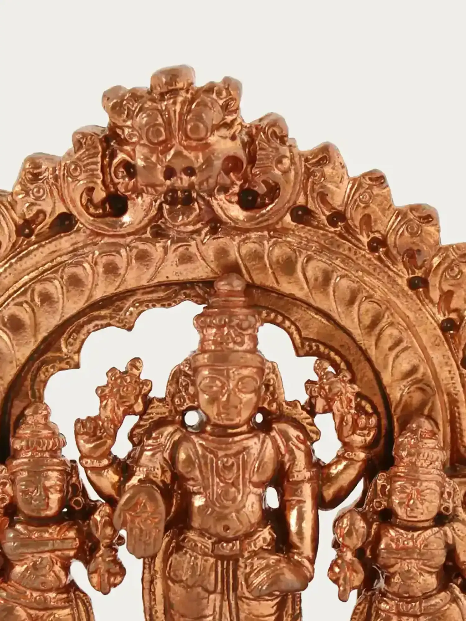 This Swamimalai copper statue set radiates the heavenly aura of Perumal (Sri Vishnu), flanked by his consorts Sridevi and Bhudevi. Vishnu, depicted in his majestic Chaturbhuja roopa (four-armed form), embodies strength, compassion and divine protection. The Devis enhance his presence—Sridevi symbolizing prosperity and auspiciousness, Bhudevi representing stability and fertility—together forming a harmonious balance of abundance and grounding energy. Haloed by a splendid Kirtimukha prabhavali, this union is considered one of the most auspicious representations for any sacred space.