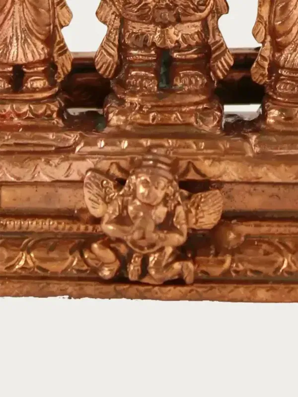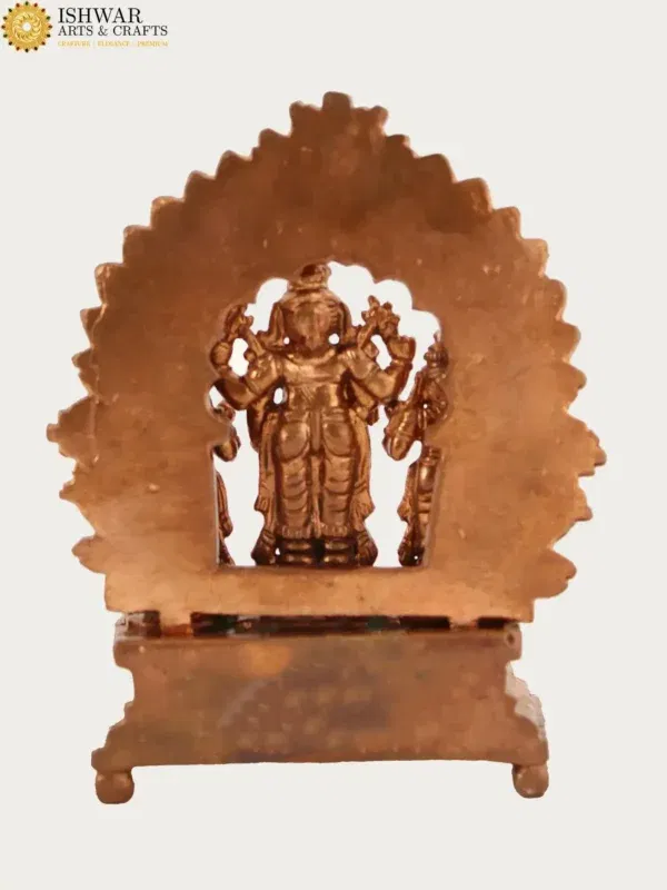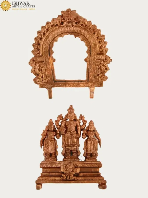 Expertly handcrafted, the statue showcases the artistry of Swamimalai’s traditional metalwork. Every detail—from the flowing drapery and ornaments to the ornate archway—reflects devotion and precision. Copper, chosen for its sacred qualities, is believed to absorb negativity and radiate divine energy. Its warm glow amplifies the spiritual essence of the piece, making it not only visually captivating but also deeply reverential.