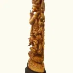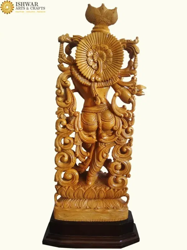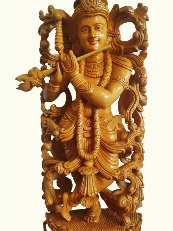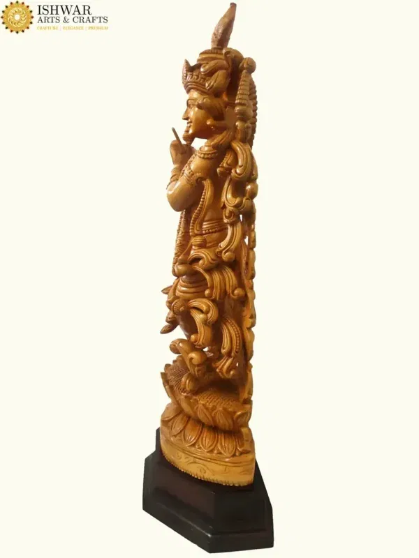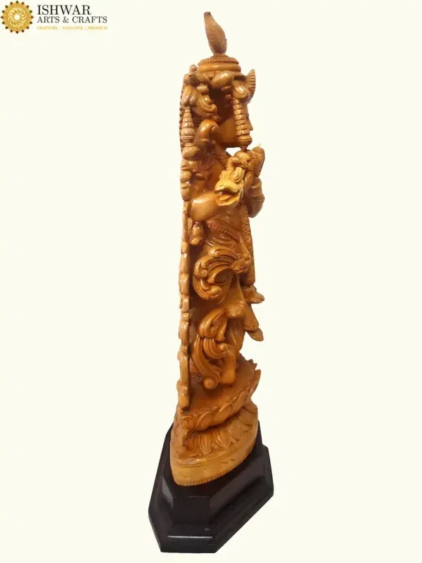 The artistry of this piece brings to life the enchanting flute player, whose gentle smile and tranquil gaze reflect both wisdom and playfulness. His fingers delicately poised upon the flute suggest melodies that, according to sacred lore, could awaken divine love in every being—from the gopis to the birds and vines of the forest. The intricate carvings of his attire, jewels and ornaments highlight the devotion and skill of the artisan, transforming natural wood into a living presence of the Lord.