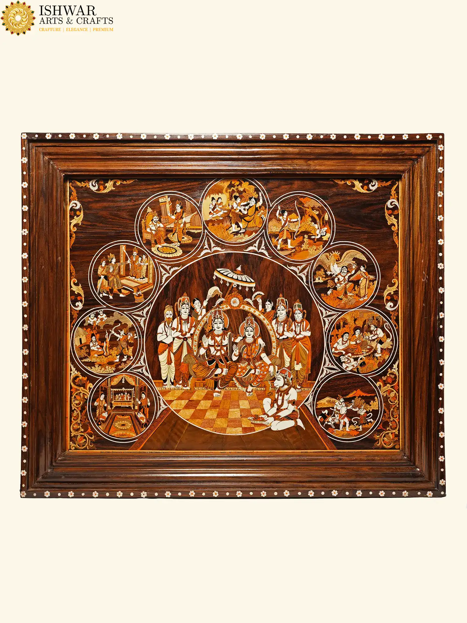 This exquisite wooden inlay artwork beautifully captures the sacred presence of Bhagwan Shri Ram, Devi Sita and Lakshmanji. Handcrafted with remarkable precision, each surrounding panel illustrates key episodes from the Ramayana, bringing devotion, culture and timeless heritage into your home. The rich natural wood textures and detailed craftsmanship make this piece a perfect addition to your living room, meditation space, temple area or as a premium spiritual gift.