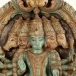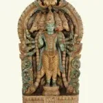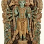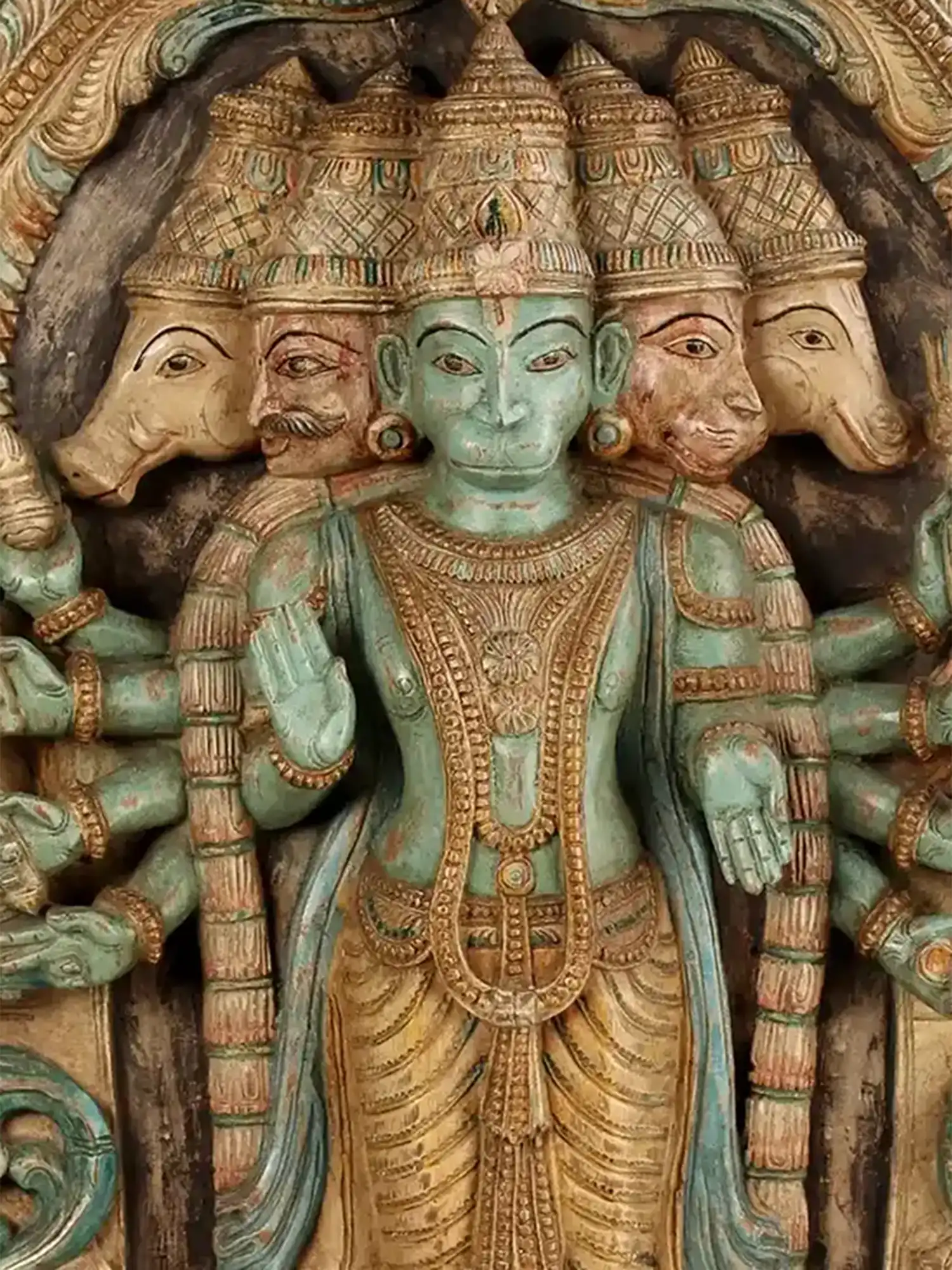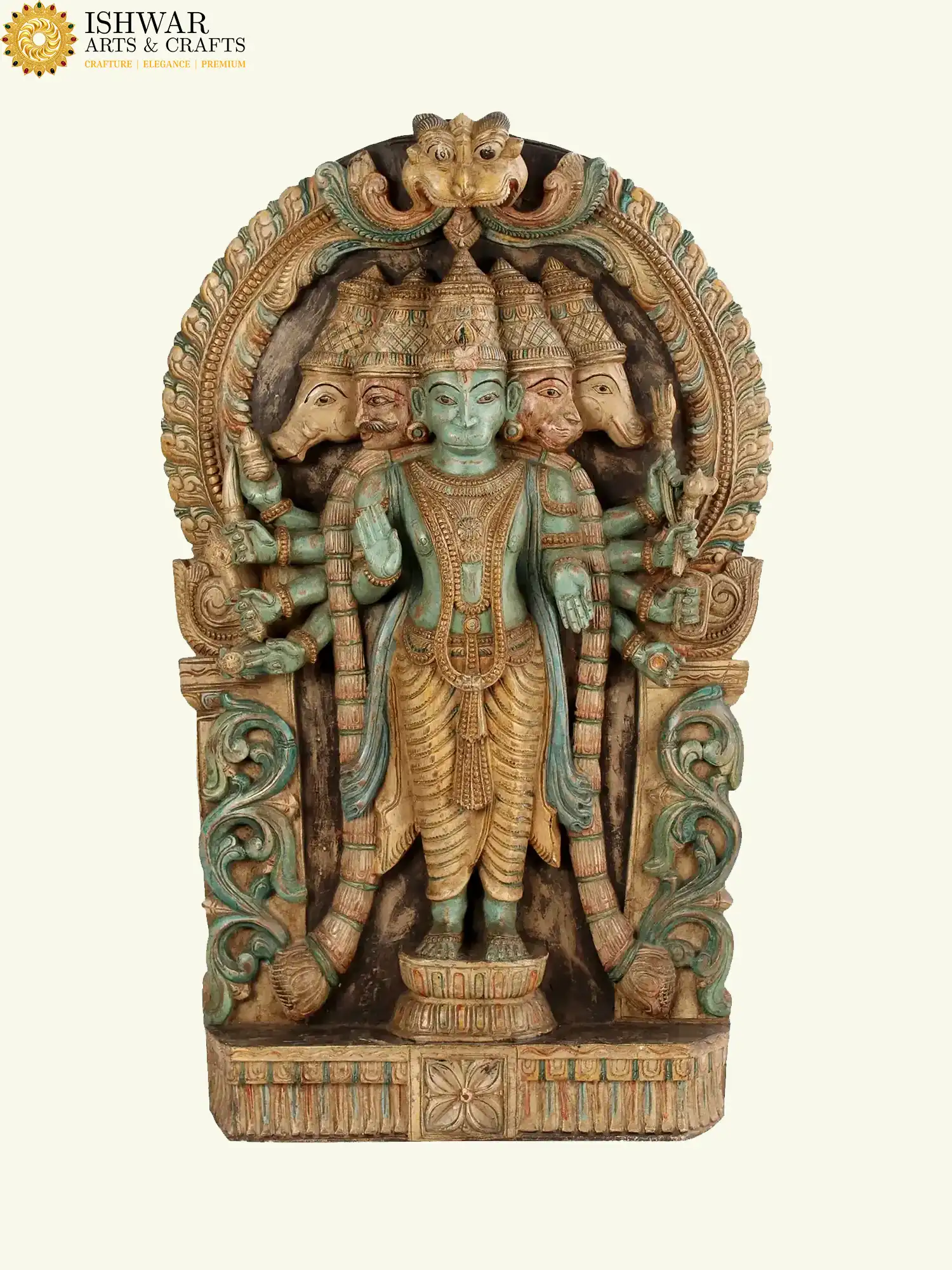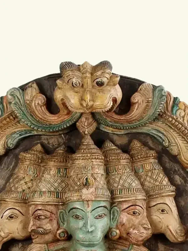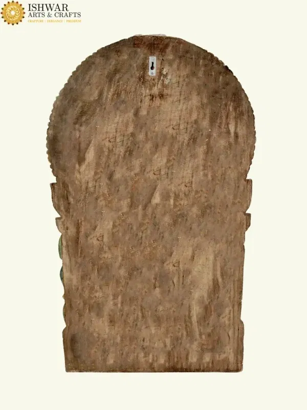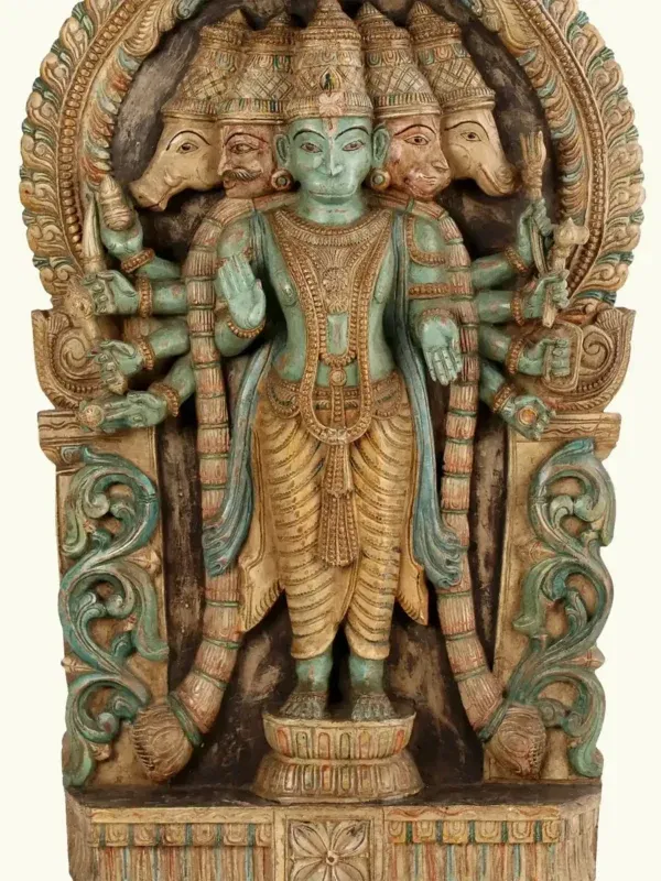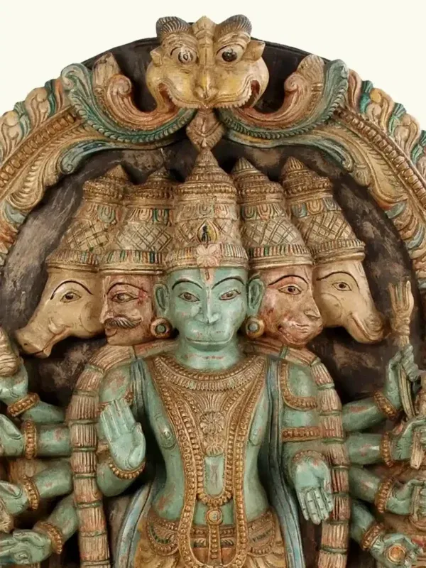 Fashioned from premium seasoned wood, the panel reflects the meticulous skill of traditional artisans. Each of the five visages—symbolizing courage, serenity, devotion, guardianship and benevolence—has been sculpted with precision, radiating divine attributes. The multiple arms, adorned with sacred emblems, signify omnipresent strength and the ability to safeguard devotees in every direction. The antique patina, enriched with subtle hues, evokes timeless reverence and echoes the sanctity of ancient temple carvings.