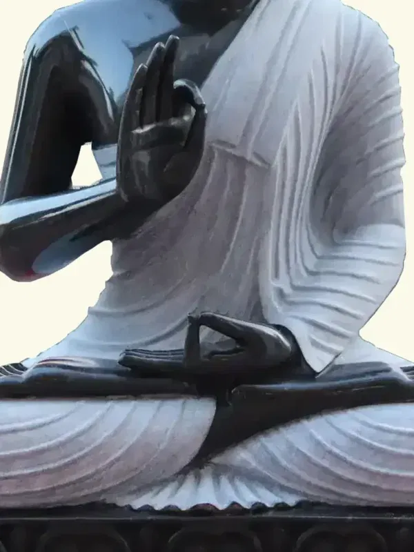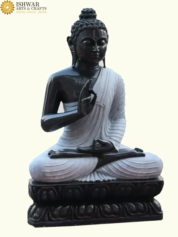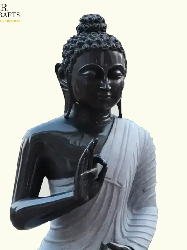 The choice of Rajasthan black marble enhances the sanctity of this statue. Its deep hue reflects the infinite depth of consciousness, while the smooth finish speaks of purity and refinement. The artisans, inheritors of a long tradition of devotion and skill, have imbued this form with reverence, ensuring that it resonates with spiritual energy. The contrast of the dark stone with the lighter tones of the robe evokes balance, a reminder of the Middle Way taught by the Buddha.