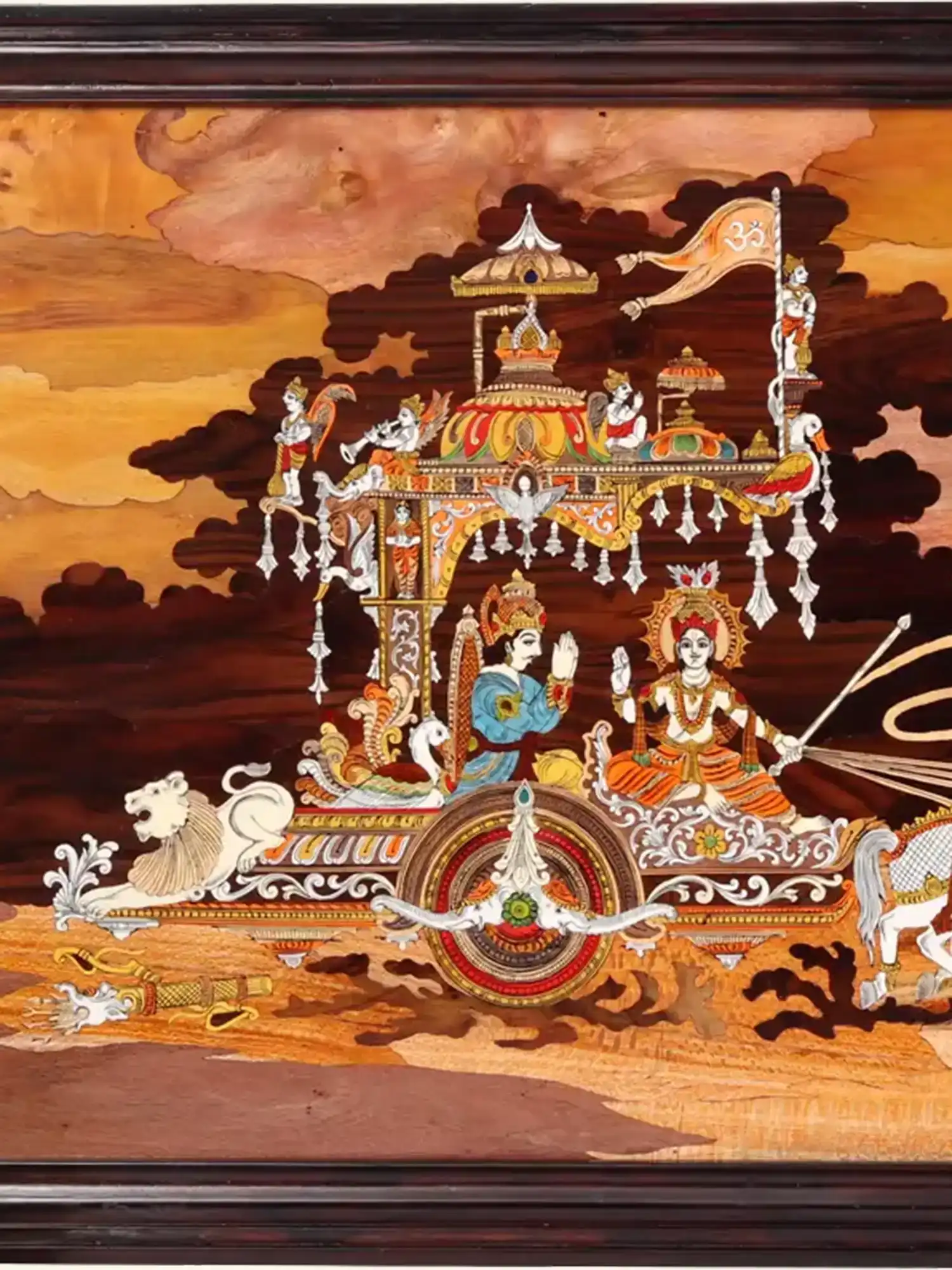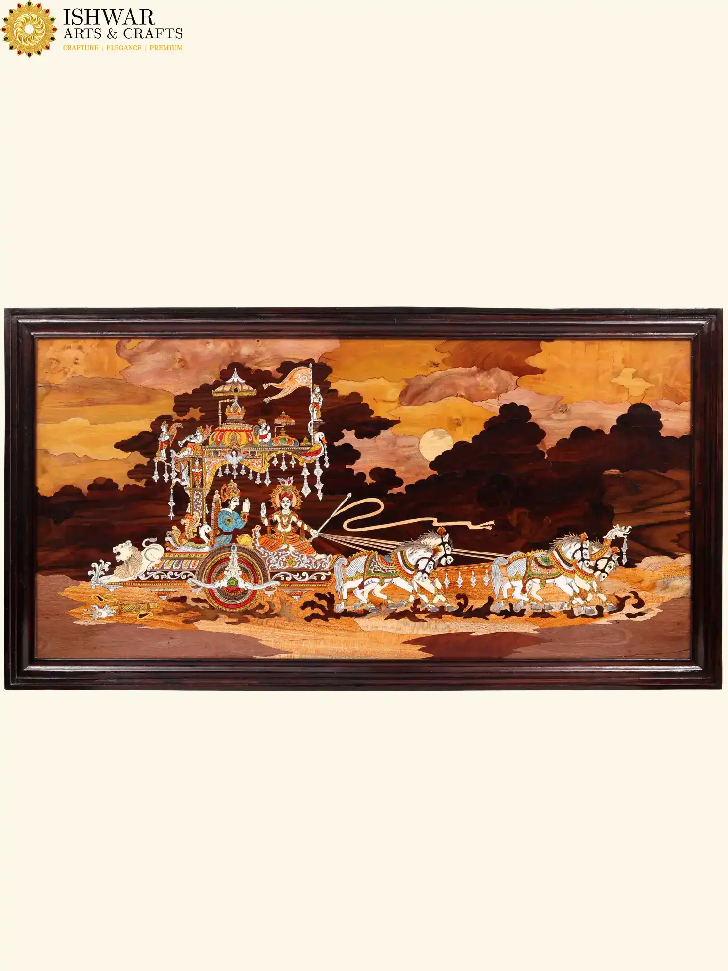 Handcrafted with exceptional precision, this Krishna–Arjuna chariot wall art radiates timeless devotion and is perfect for elevating any home, office or meditation space. The rich Rosewood background enhances the depth and artistry, making it a striking masterpiece that blends heritage with divine elegance.