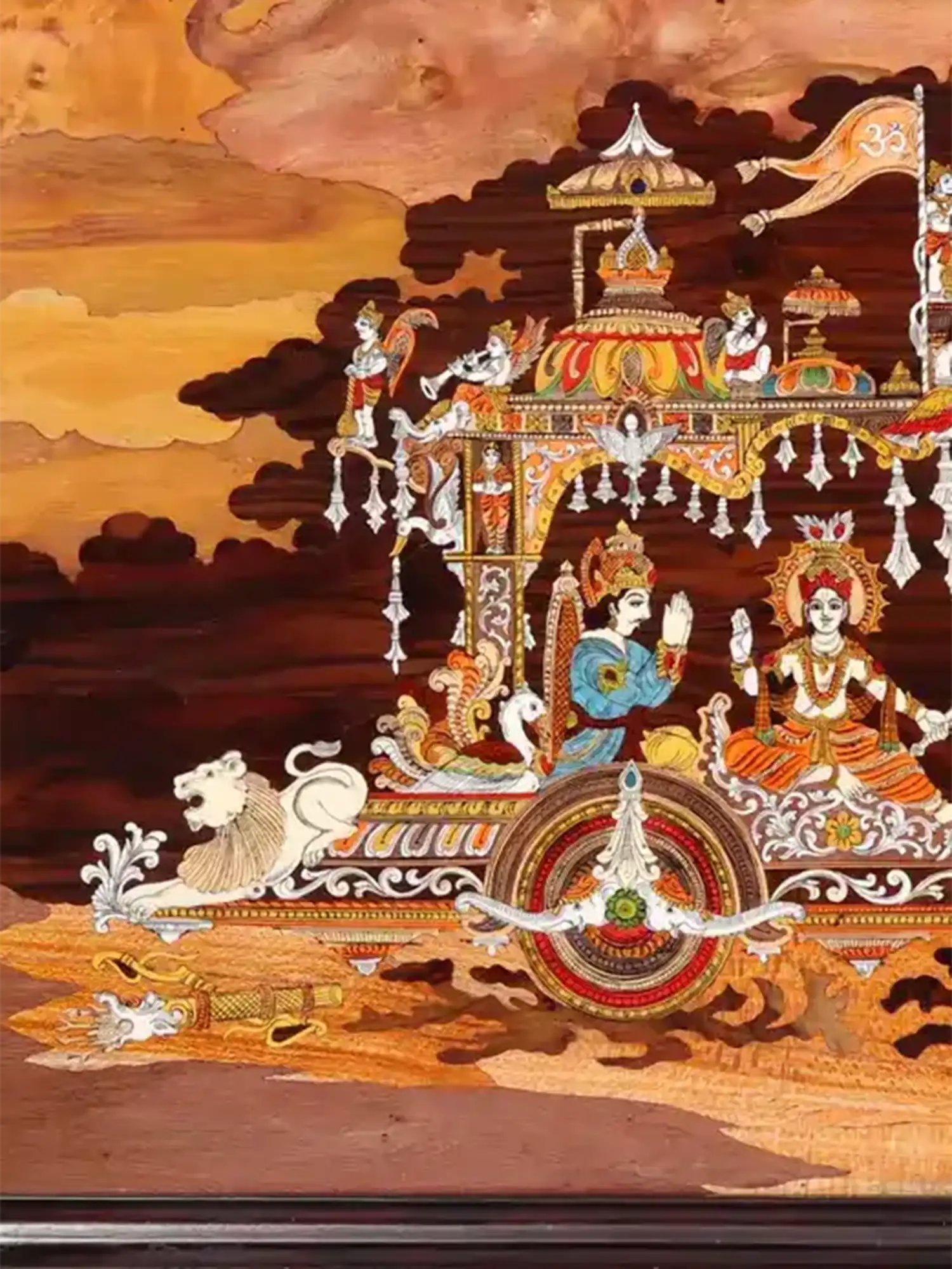 This exquisite wooden artwork beautifully illustrates the divine moment of Lord Krishnaguiding Arjuna’s chariot on the sacred battlefield of Kurukshetra. Crafted with intricate detailing and vibrant traditional colours, the piece captures the essence of the Bhagavad Gita, symbolizing courage, dharma and spiritual awakening. The dynamic portrayal of horses, the ornate chariot and the celestial atmosphere reflect the eternal message of righteousness and inner strength.