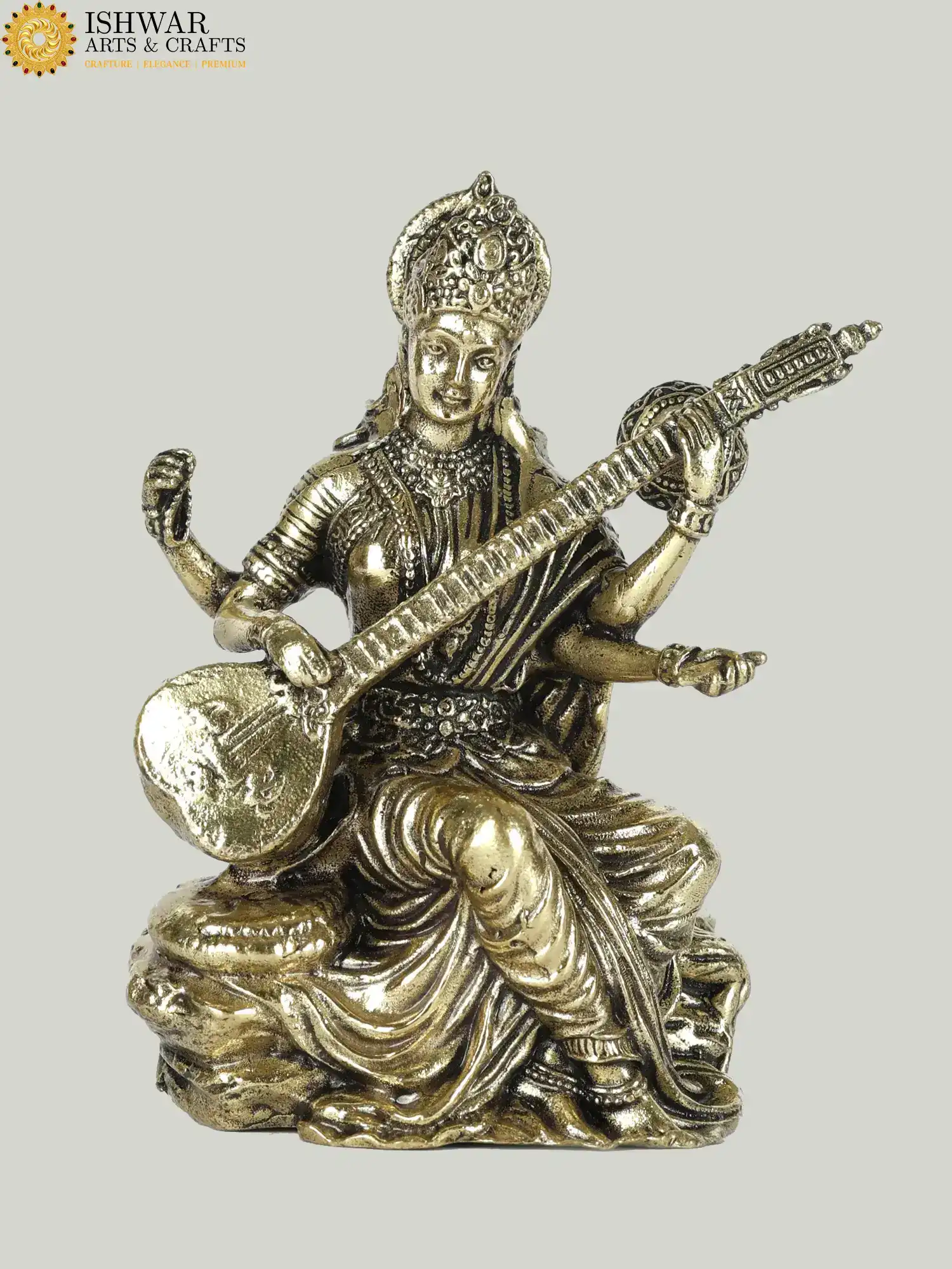 5″ Superfine Small Saraswati Devi Statue Playing Veena | Handcrafted Brass Statue