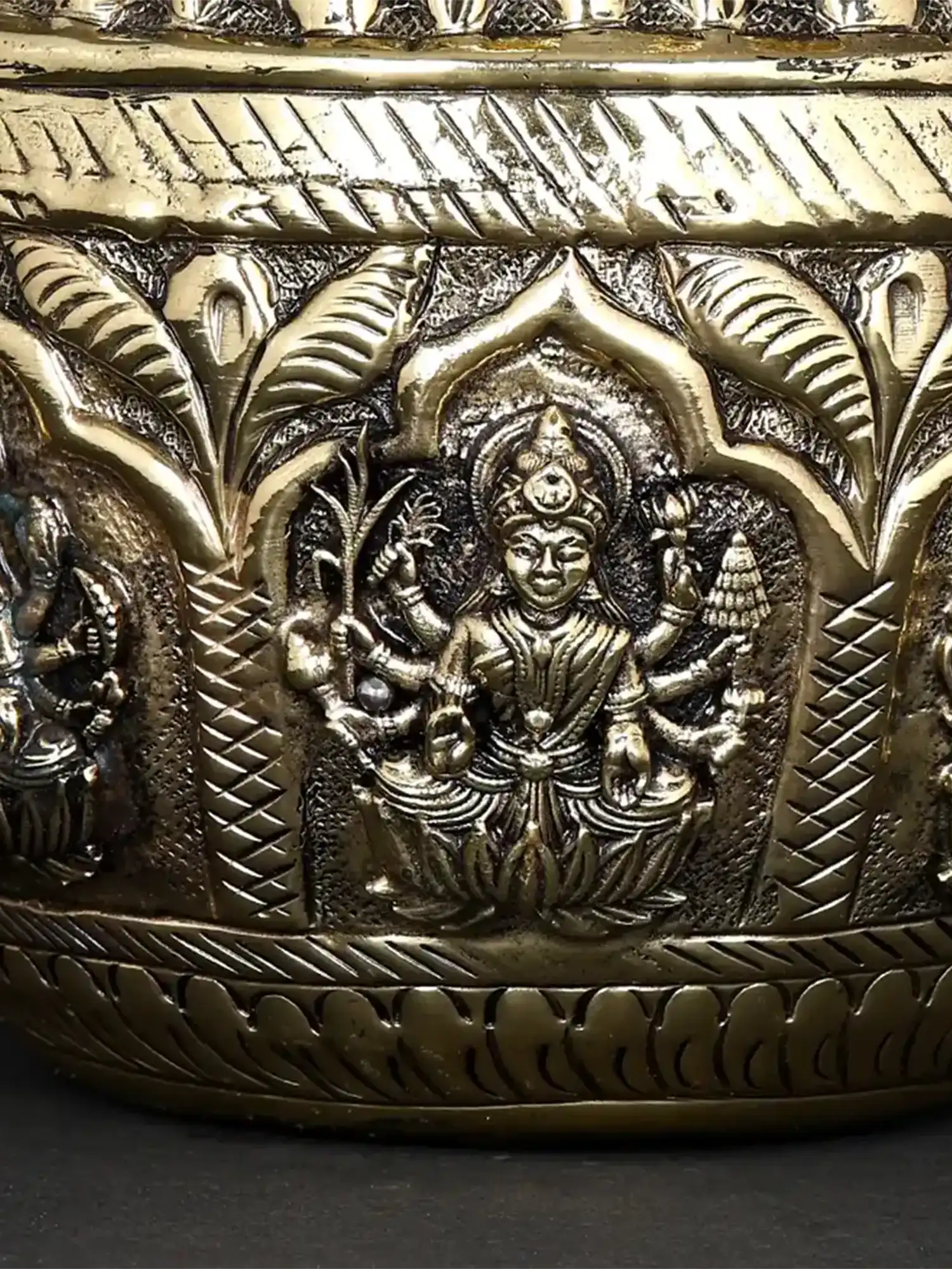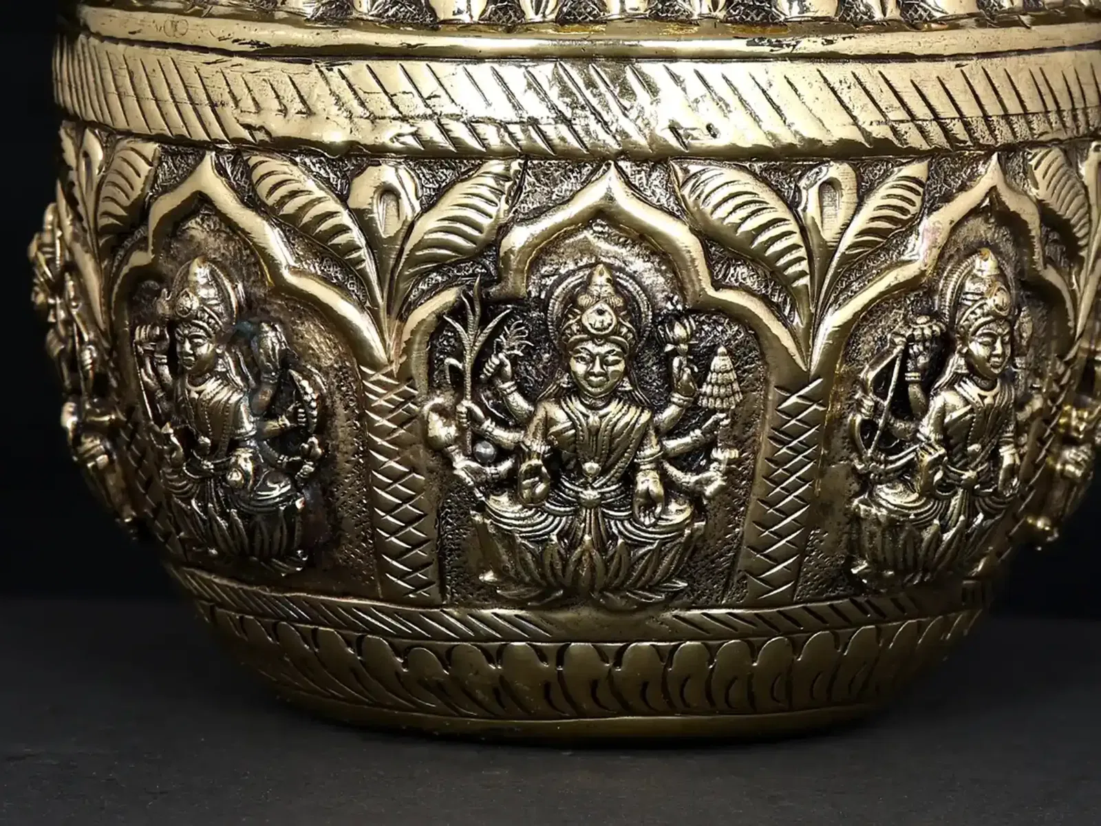 The richly embossed Ashtalakshmi motifs radiate spiritual energy, making this brass kalash an auspicious choice for puja ceremonies, Navratri, Diwali, Lakshmi Pujan, temple offerings, home altars and Vastu rituals. Its superfine detailing, lustrous golden sheen and traditional temple-style carvings elevate any sacred space with divine charm and devotional ambience.