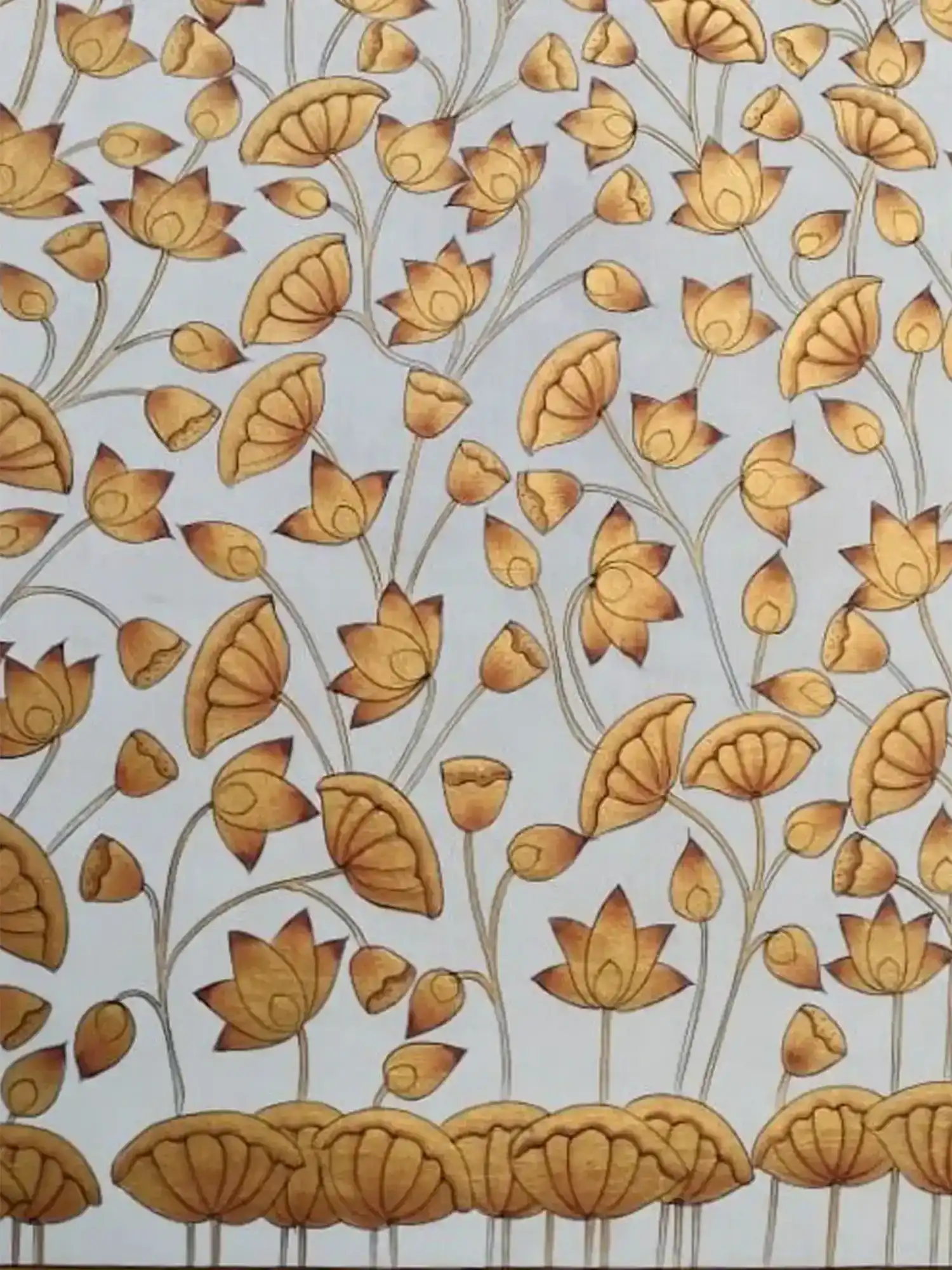 The artist’s refined technique creates a harmonious web of buds and leaves, inviting the viewer into a realm of quiet reflection and inner peace. The soft, muted palette enhances the painting’s meditative aura, making it an ideal décor choice for spiritual spaces, meditation rooms and elegant contemporary interiors.
