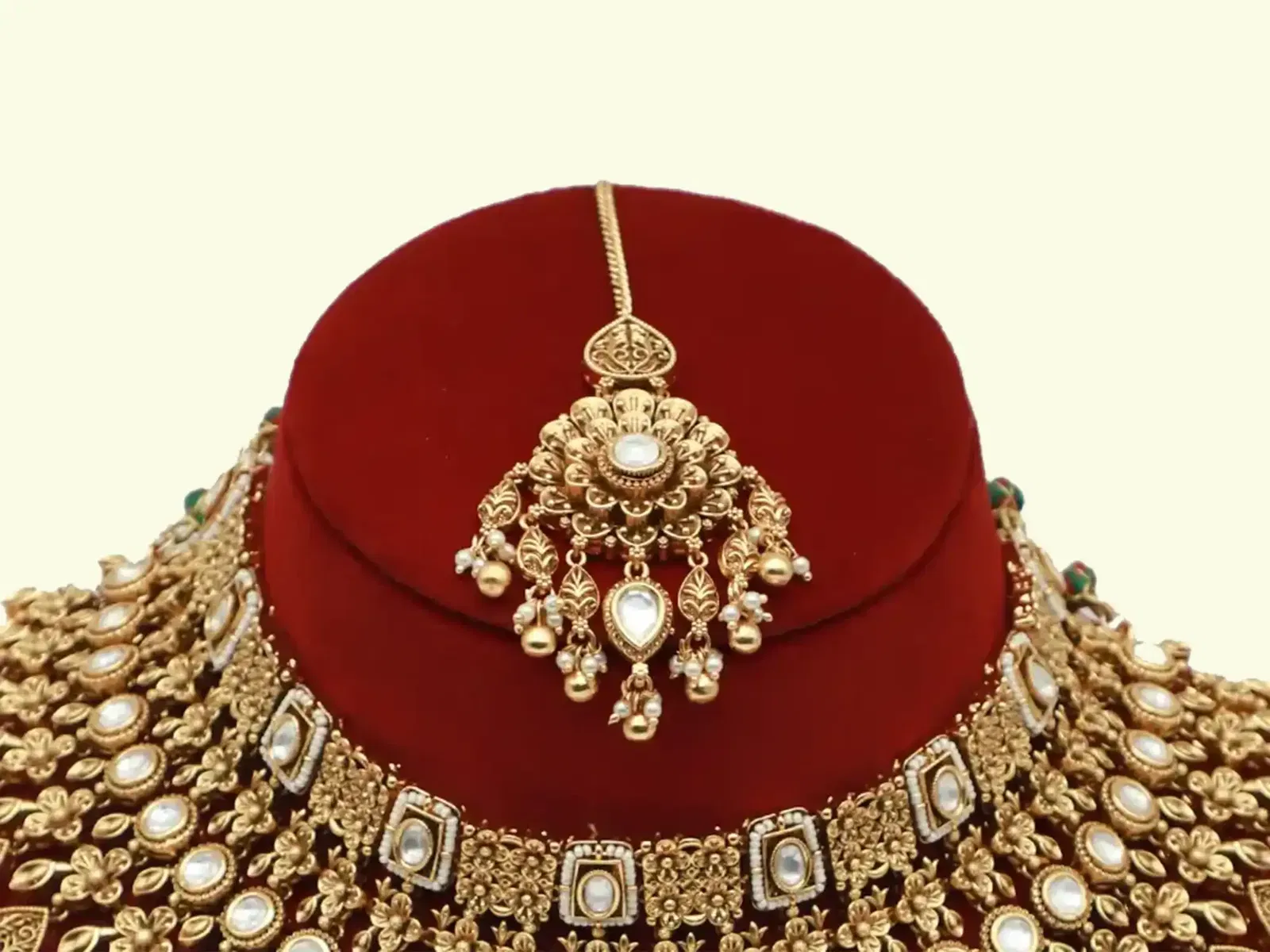 The wide choker-style necklace is decorated with kundan-style stones, carved motifs, hanging bead droplets and layered floral patterns—creating a breathtaking, royal bridal look. The matching earrings and maang tikka perfectly complement the necklace, making it a complete bridal set for weddings, sangeet, reception and festive occasions.