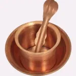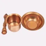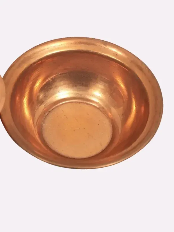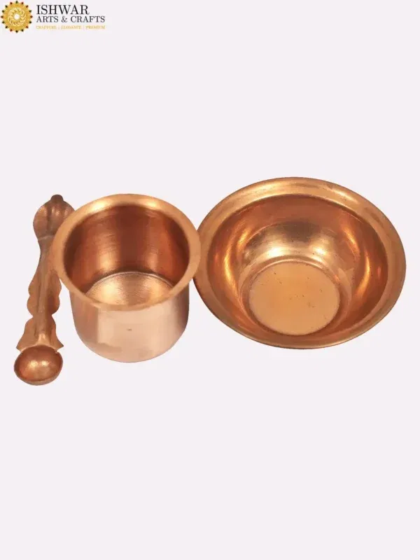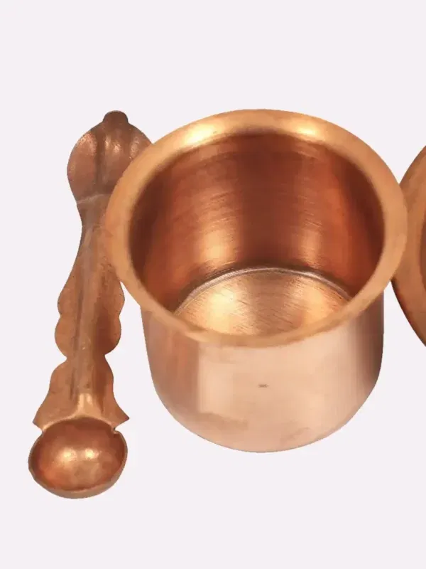 The Copper Pancha Patra, comprising a cylindrical vessel, spoon and bowl, is a vital element in ritual worship. Each component is crafted to embody purity and devotion, ensuring that the offerings placed within are infused with auspicious energy. When sacred substances such as water, milk or ghee are held in copper, they are believed to absorb its positive vibrations, magnifying the potency of the ritual and fostering a deeper connection with the divine.