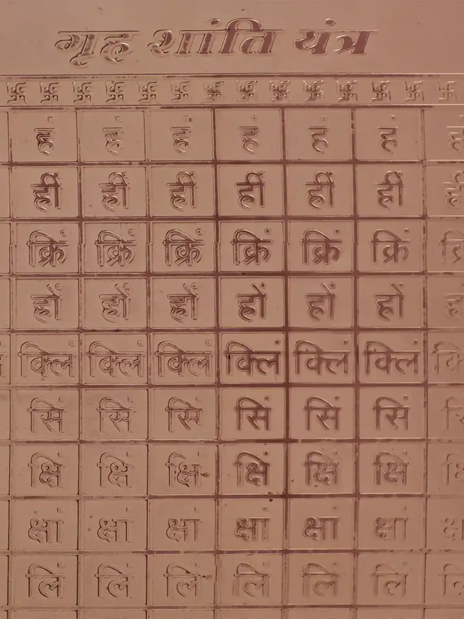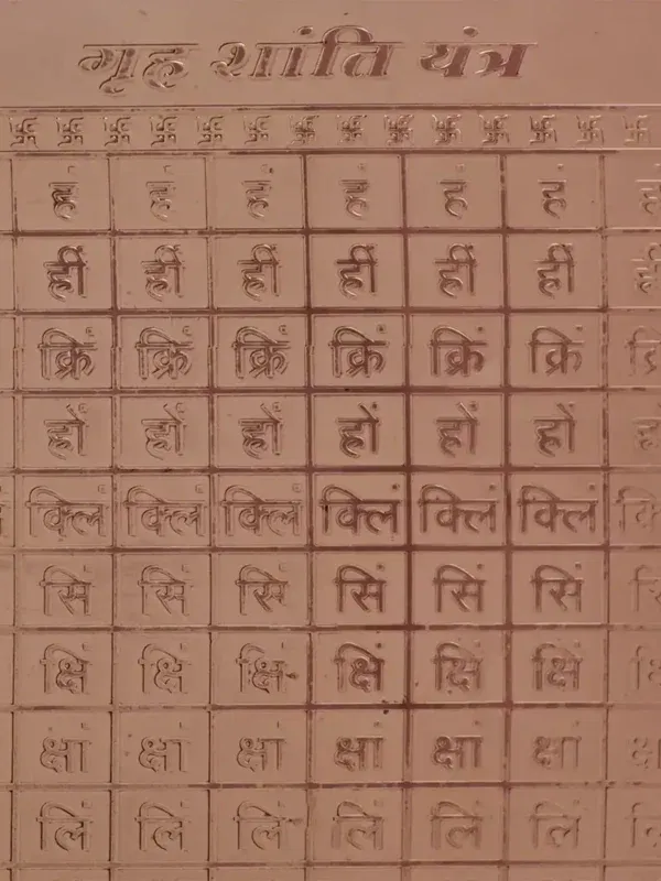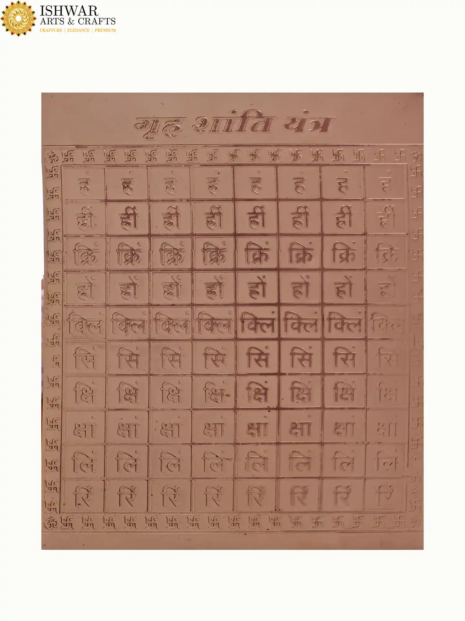 The Griha Shanti Yantra, as depicted in the copper plate you’ve shared, is a powerful spiritual tool used in Hindu tradition to invoke peace, stability and positive energy within the home. Engraved with sacred syllables like “हं”, “धं”, “किं”, and bordered with auspicious symbols such as “ॐ”, “श्री” and the “स्वस्तिक”, this yantra is designed to harmonize the vibrations of a living space.