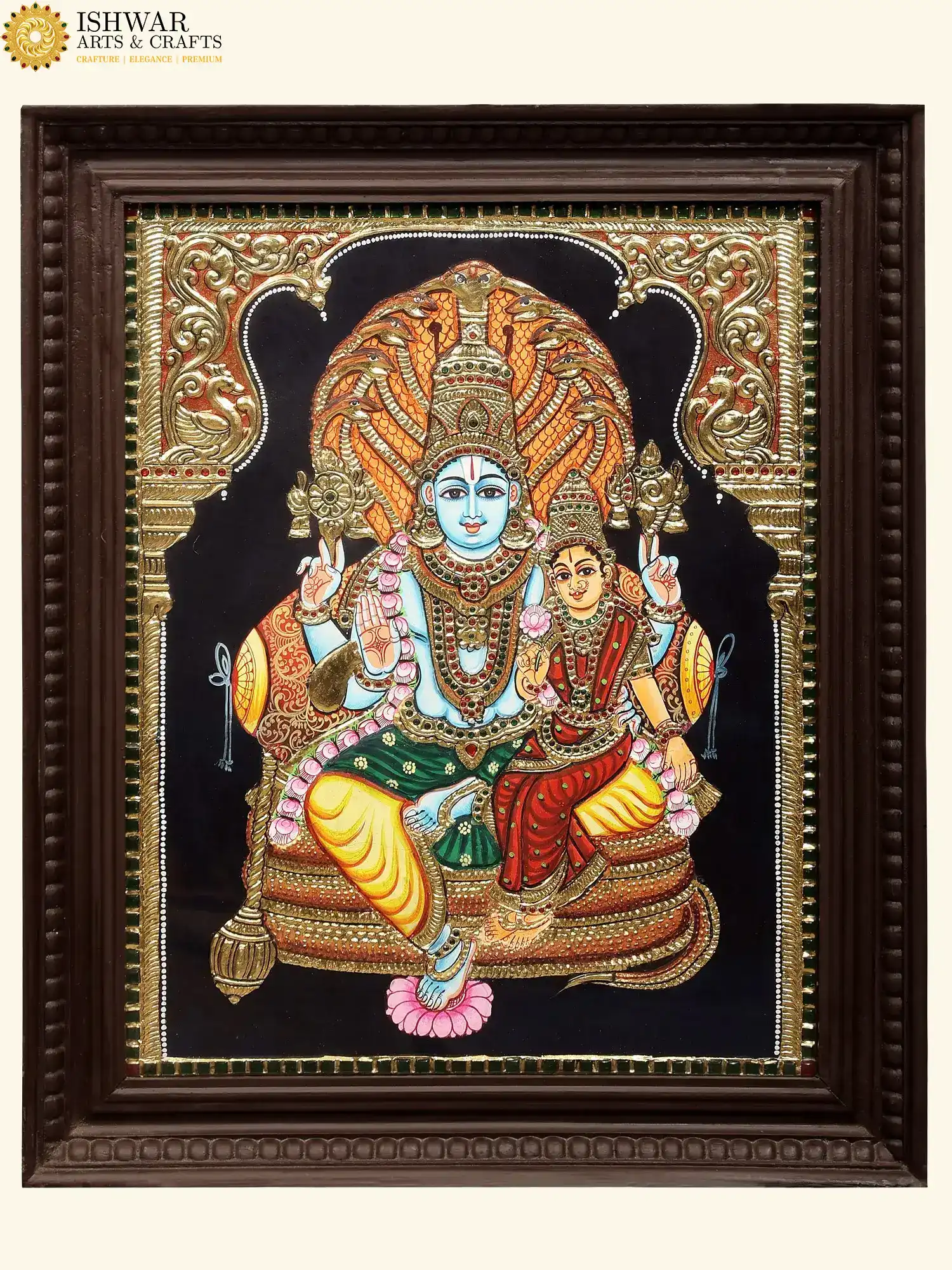 Lakshmi Narayan Seated on Sheshnaga Tanjore Painting with Frame | 24k Gold | Handmade