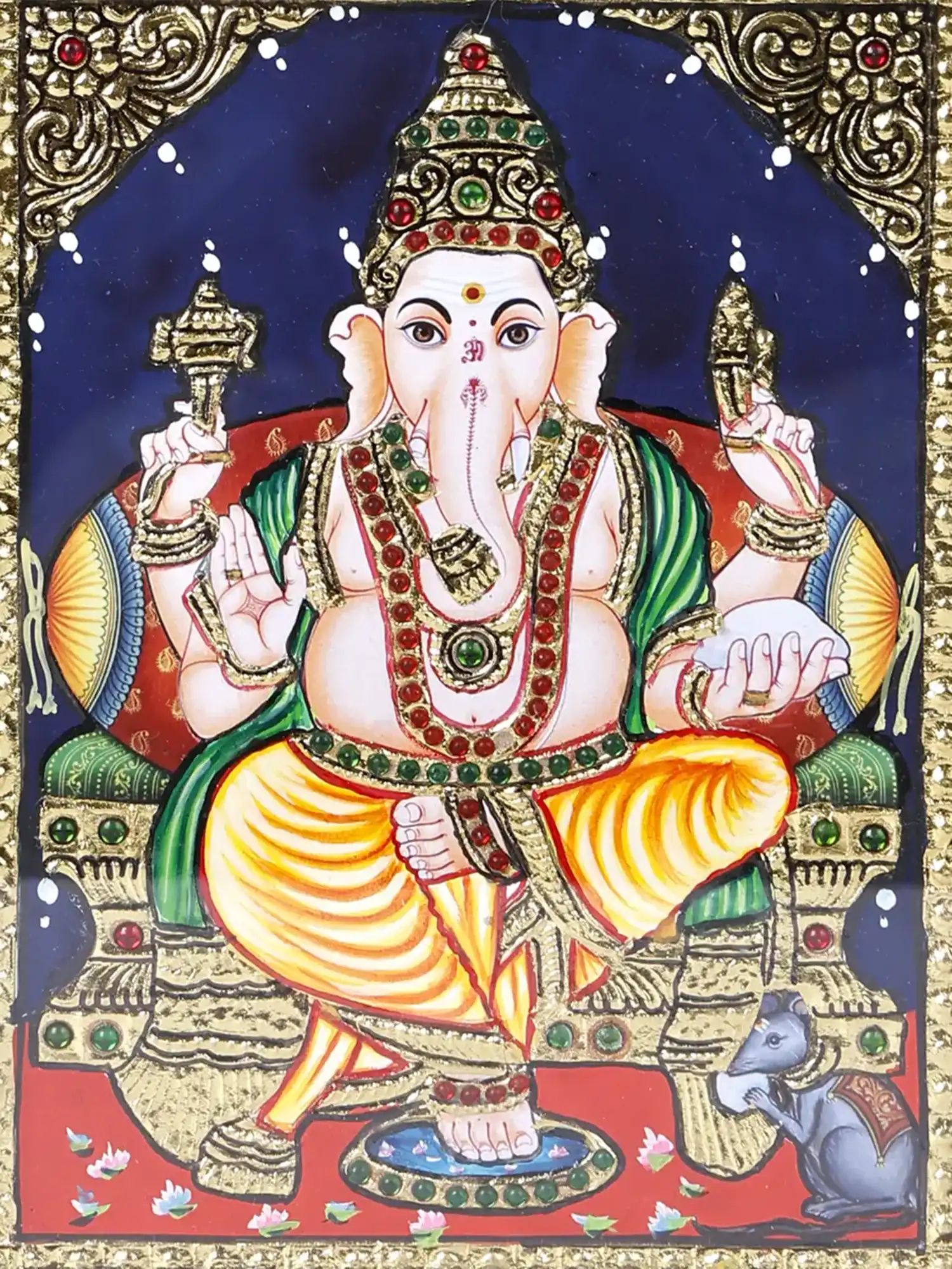 Crafted in the timeless Thanjavur style, the artwork radiates spiritual opulence through its intricate detailing and luxurious use of gold foil, silver accents and hand-set semi-precious stones. Every element, from Ganesha’s serene countenance to his divine attributes, reflects extraordinary precision and devotion. The Mushaka (his loyal companion), the Modaka (symbol of inner sweetness) and the sacred Shankha (symbol of purity and cosmic harmony) are rendered with exquisite clarity, elevating the painting’s artistic and spiritual worth.