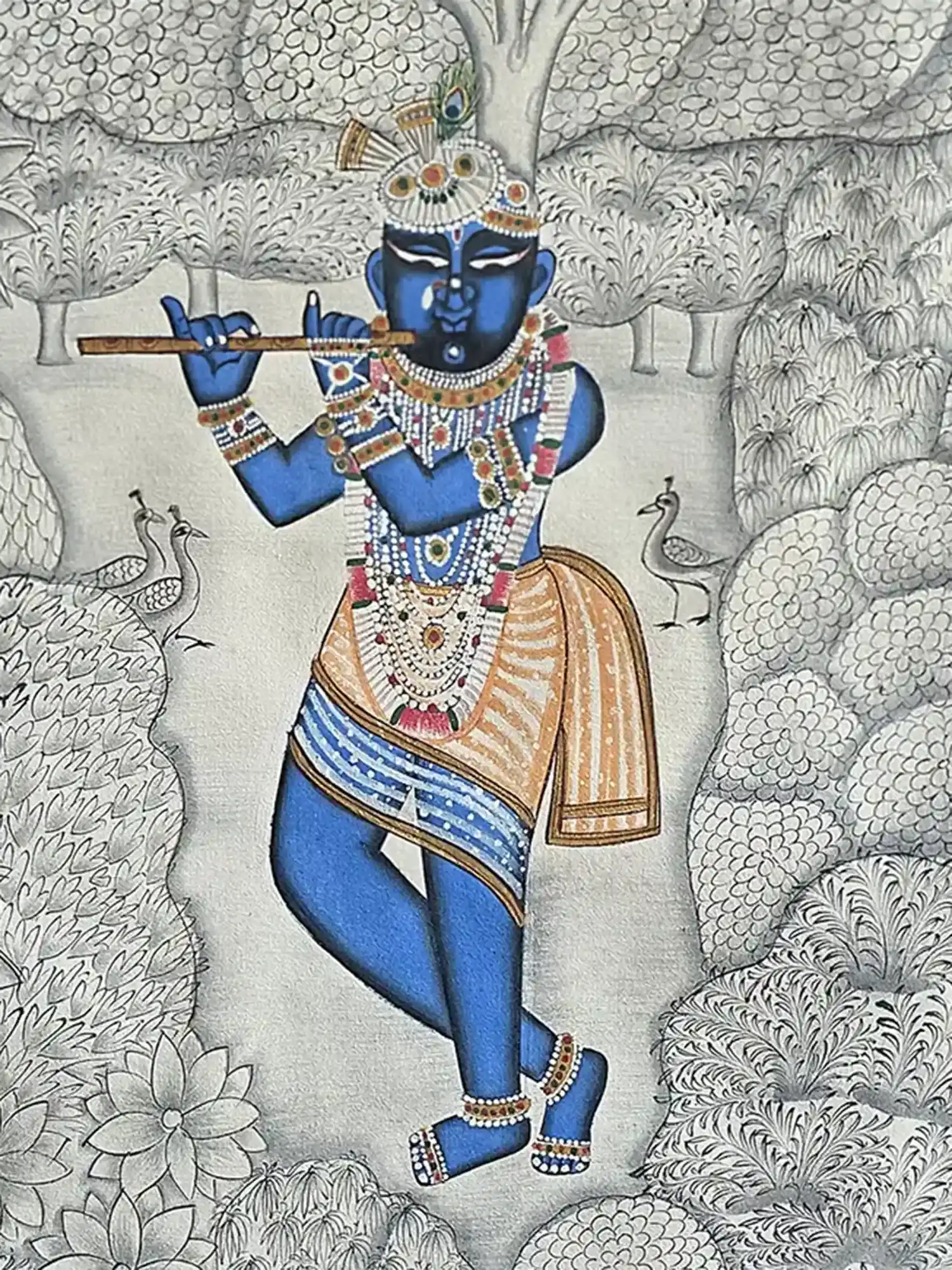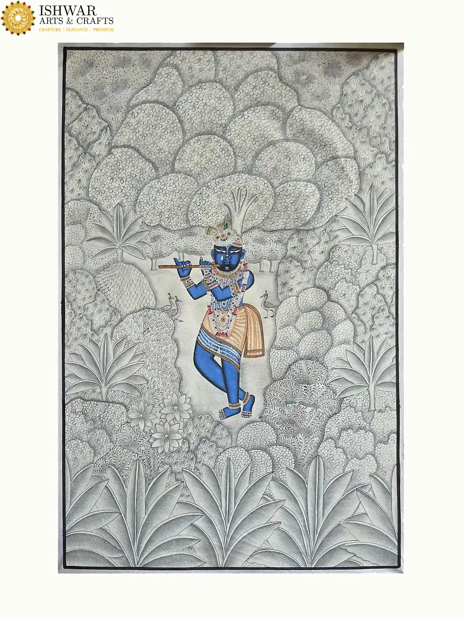 This mesmerizing Pichwai-style Krishna painting captures the divine charm of Shrinathji standing gracefully in the sacred groves of Vrindavan. With his enchanting blue form and melodious flute, Krishna radiates an aura of peace, devotion and eternal bliss. The artist beautifully contrasts the vivid depiction of Krishna with a serene monochrome forest, highlighting the Lord as the soul of nature and the embodiment of divine love.