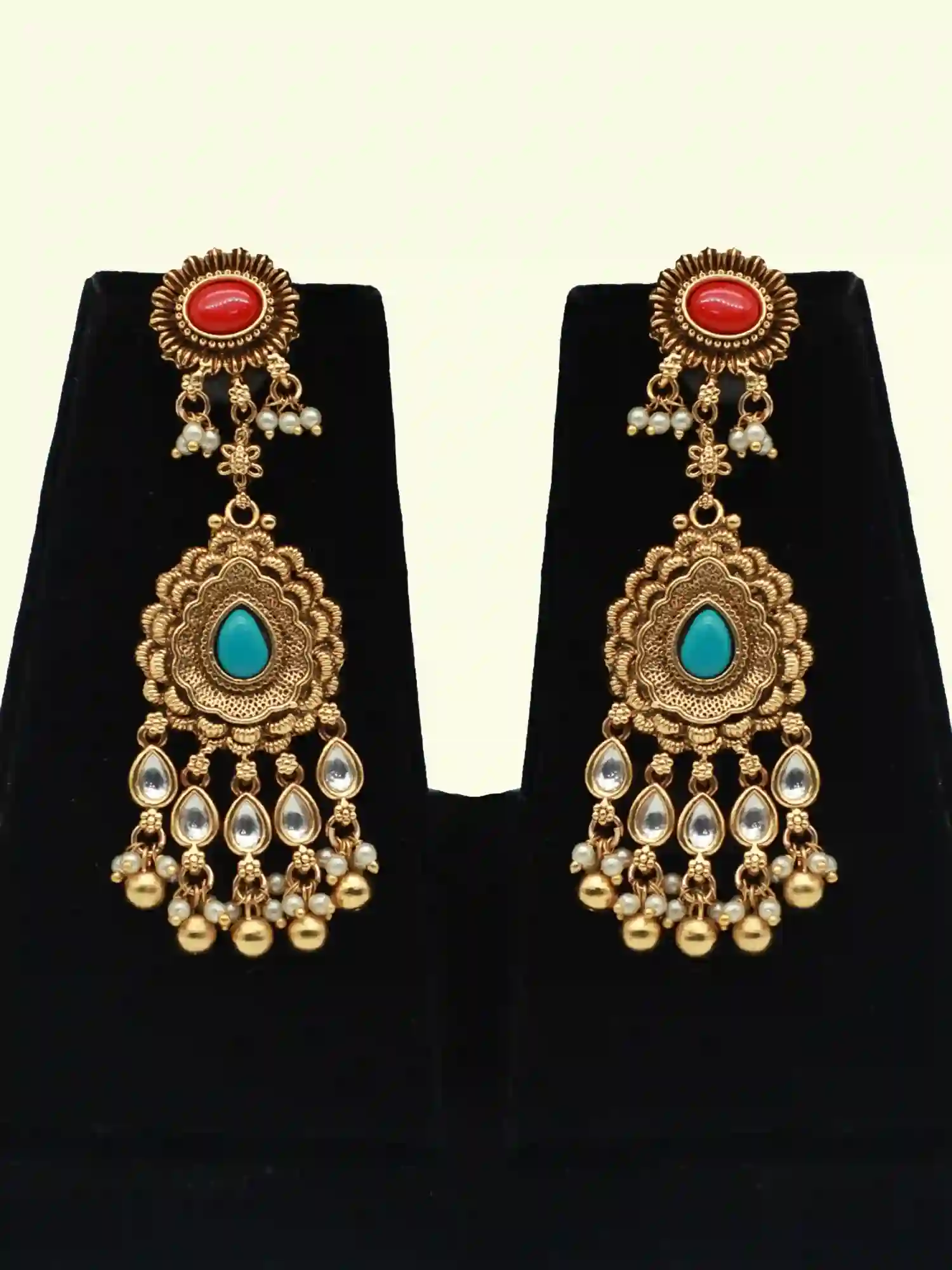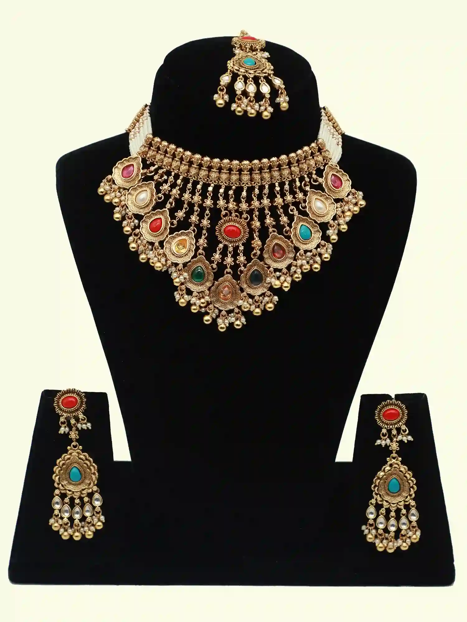 Make every bridal moment unforgettable with this Designer Multicolour Stone Necklace Set featuring exquisite detailing, vibrant gemstone accents and elegant bead hangings. Crafted in an antique gold finish, this grand jewelry set includes a beautifully layered necklace, matching earrings and a coordinated maangtika—perfect for brides seeking a royal and traditional look.