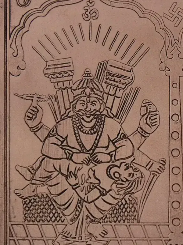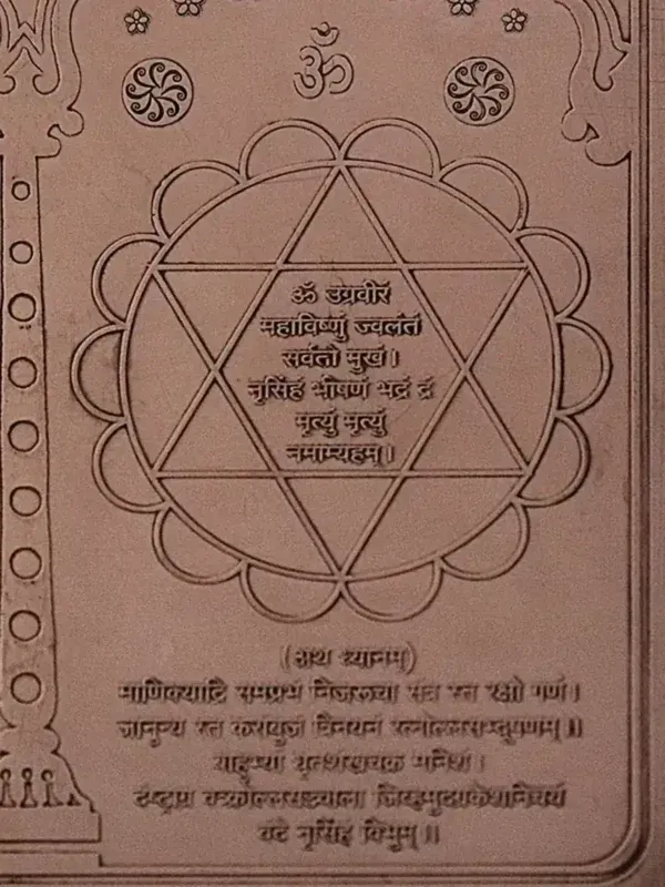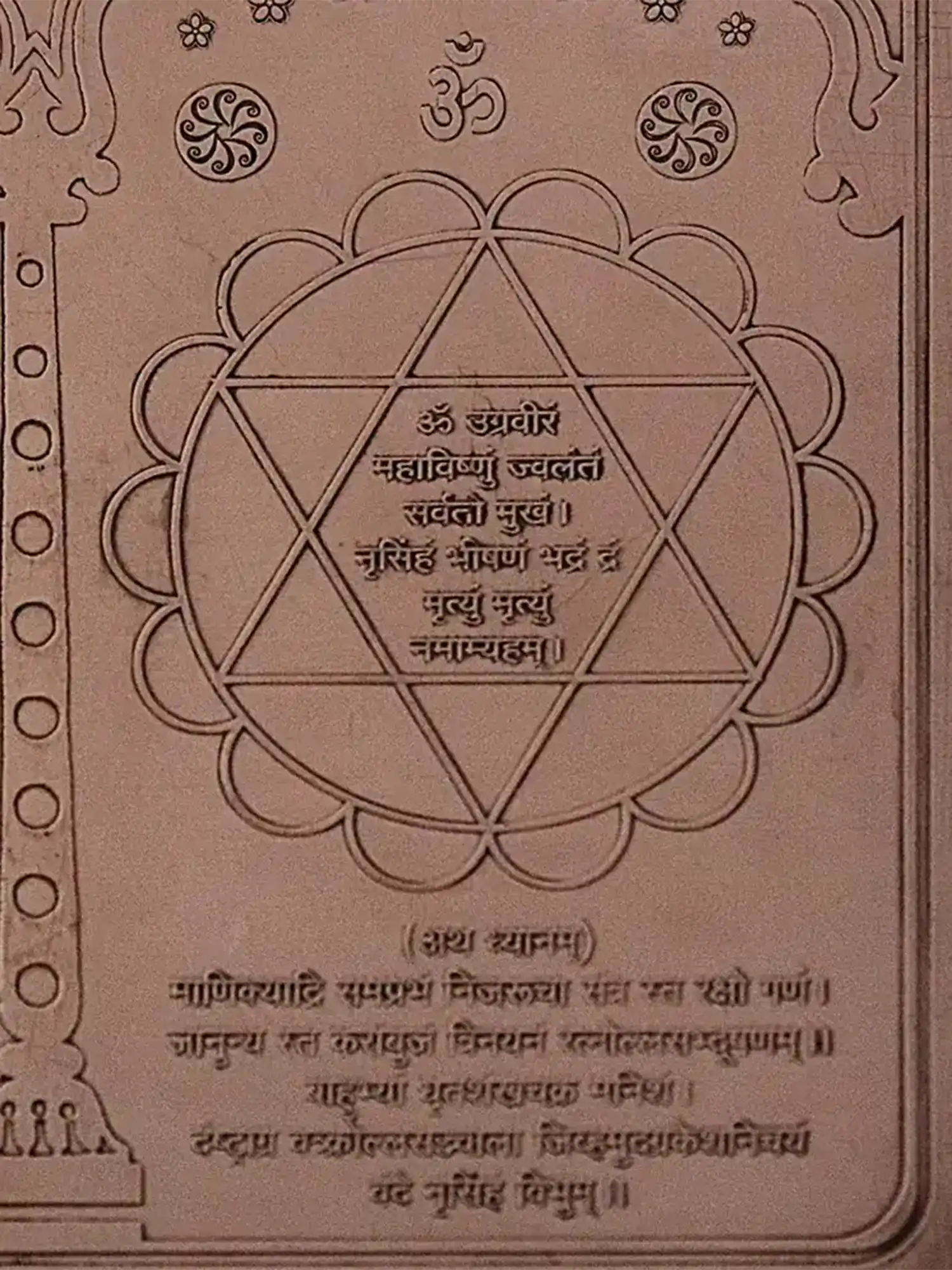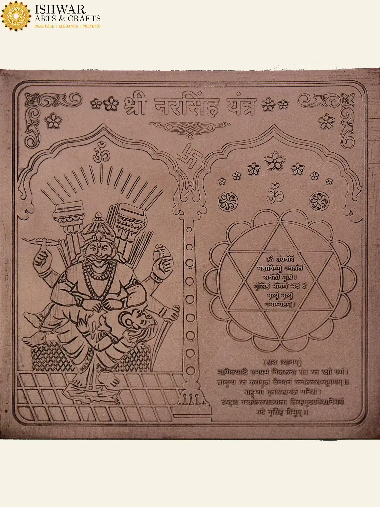This copper-crafted Narasimha Yantra is a powerful geometric design dedicated to Lord Narasimha, the fierce incarnation of Lord Vishnu. Revered as the protector of devotees, Narasimha emerged to vanquish evil and restore dharma, symbolizing divine courage and unwavering protection.