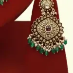 Elevate your ethnic look with this Traditional Matte Gold Necklace Set, beautifully crafted with intricate carvings and adorned with ruby-toned stones, shimmering kundan detailing and graceful green bead hangings. Designed to reflect the richness of Indian heritage, this luxurious necklace set brings together artistic craftsmanship and timeless elegance, making it the perfect choice for brides and women attending grand celebrations.